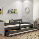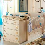 The simplest design is represented by a bed and a chest of drawers. The side headboard transforms into a small table. The sleeping place is freed from the chest of drawers, reaching a length of 170 cm, and can be used for an older child. The chest of drawers becomes a separate element. The design can be equipped with drawers at the bottom for storing linen.