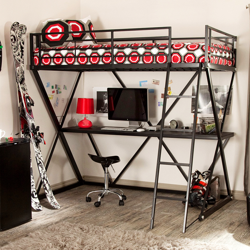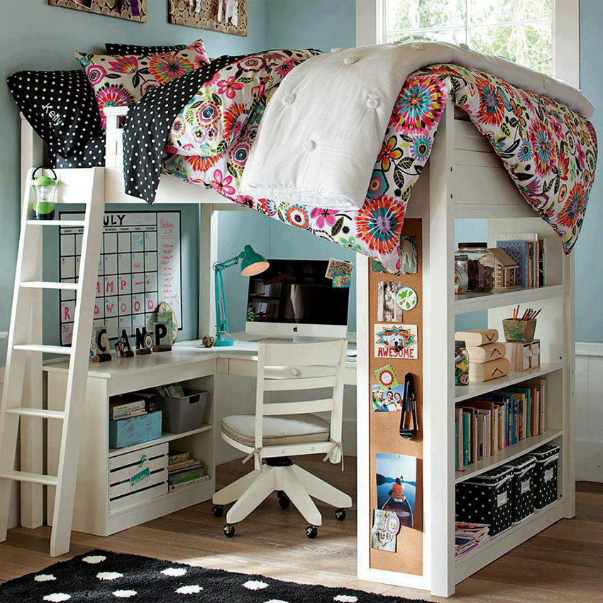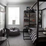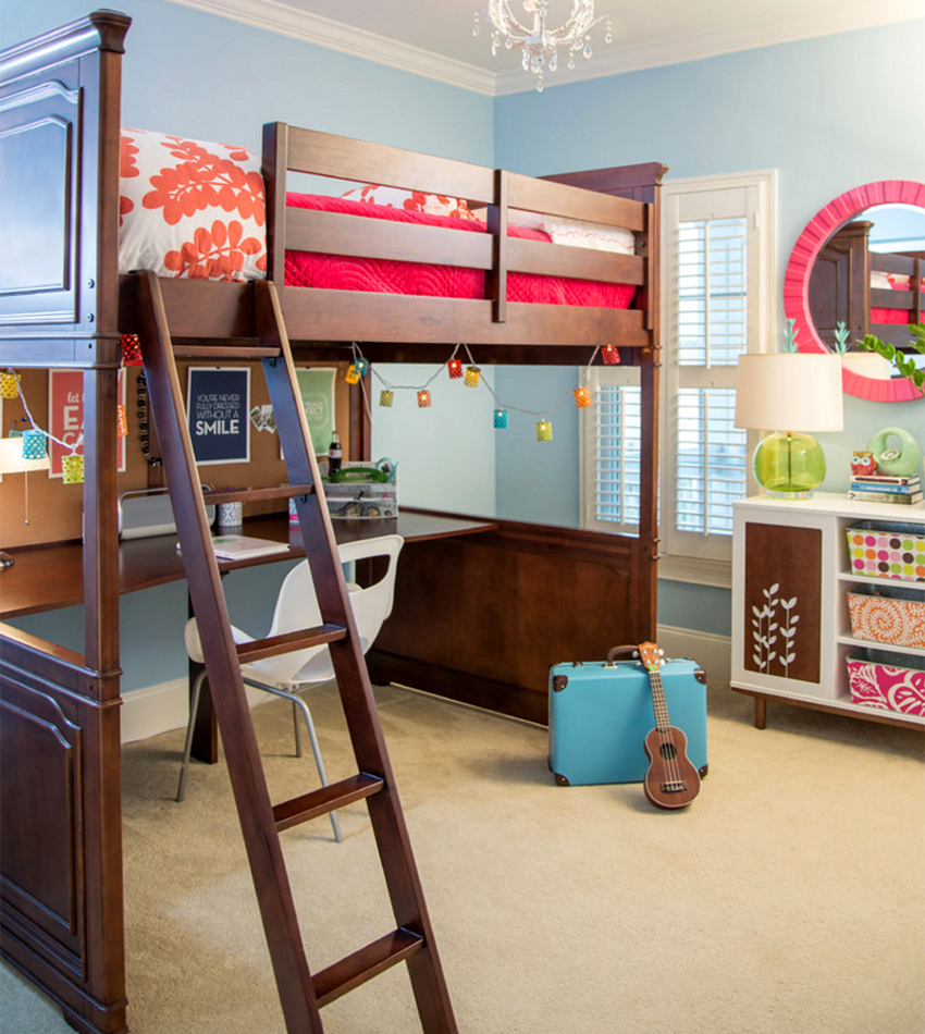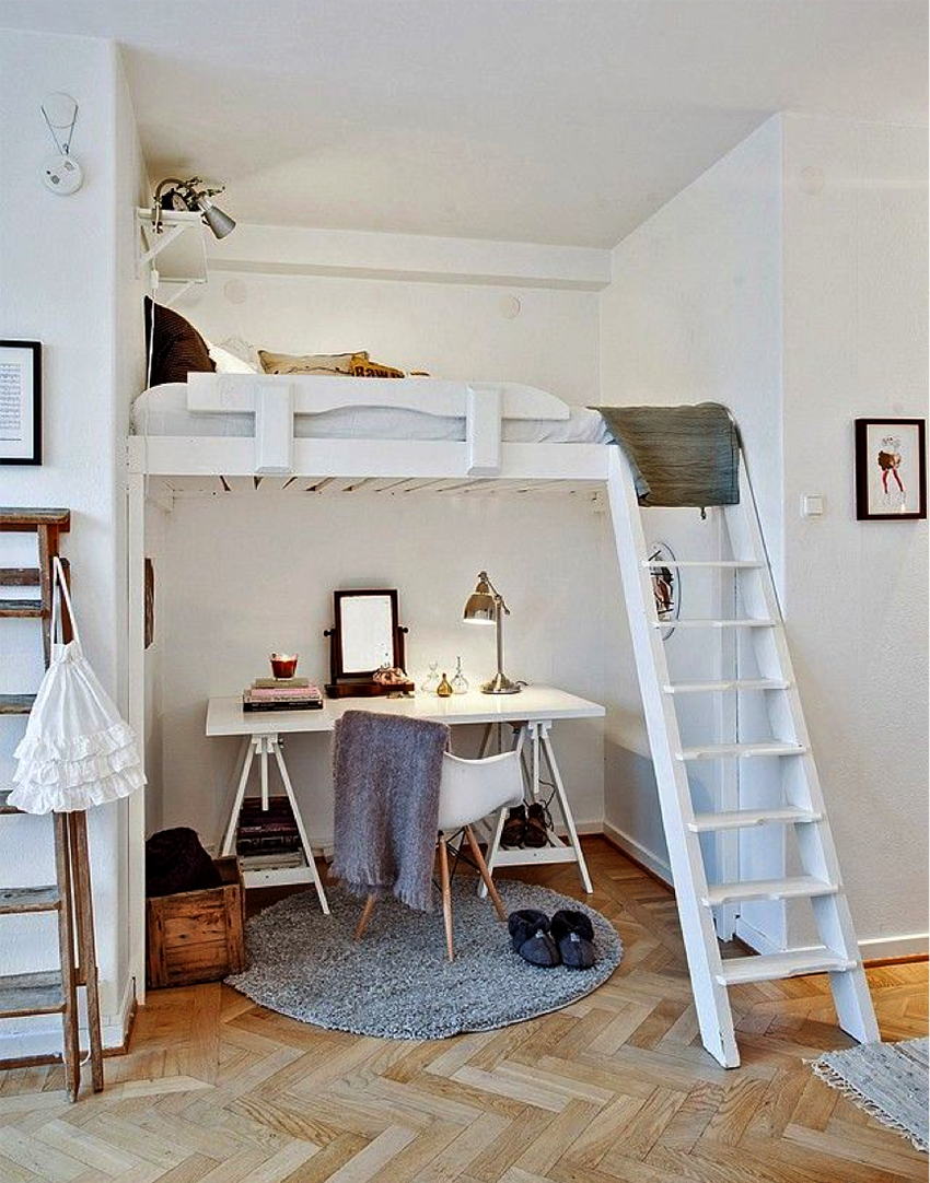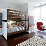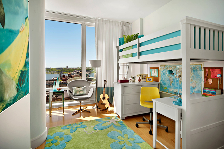 Loft beds for teenagers differ from models for younger children. In the lower part of the structure, there can be a working area in the form of a computer table, a spacious wardrobe or a sports simulator. Different versions of the product can be seen in the photo of bunk beds for teenagers.