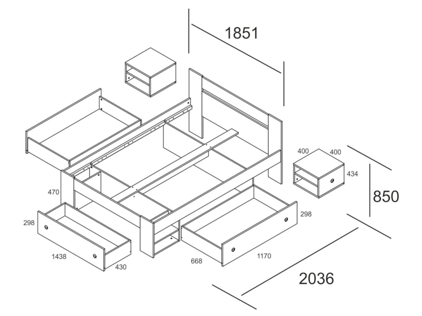 - Brusali. It has a standard width of 160 × 200 cm and is equipped with spacious storage boxes located on both sides of the bed. The height of the foot is 46 cm, and the headboard reaches 93 cm.