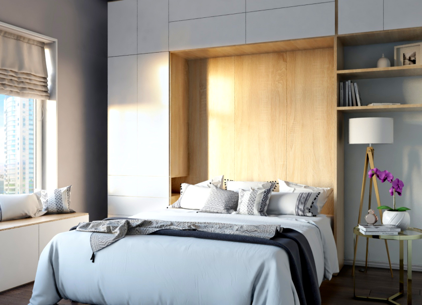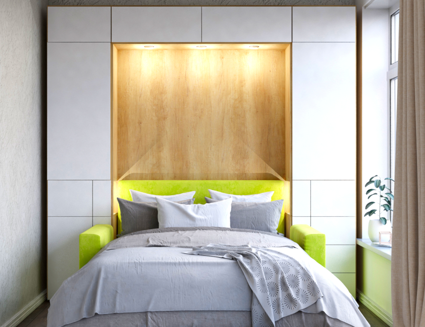 The wall bed is used when the room is divided into functional areas. This option is usually used in studio apartments, as they need a competent distribution of the usable area. The folding wall is a sleeping place, which is removed into the partition in the daytime.