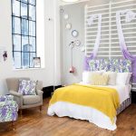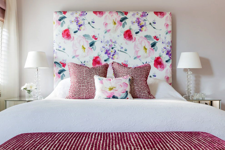 - Application of floral prints. This option is suitable for fans of romance. A vivid example is the soft upholstery of the backrest made of material with flowers or the use of a floral panel instead of a headboard.