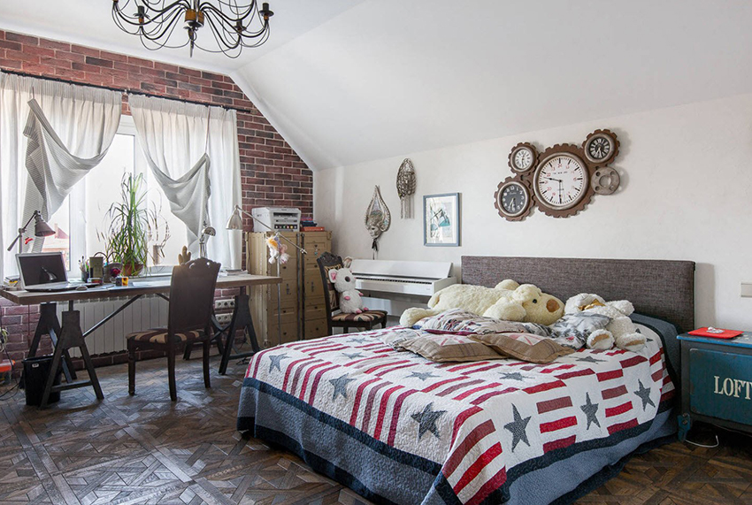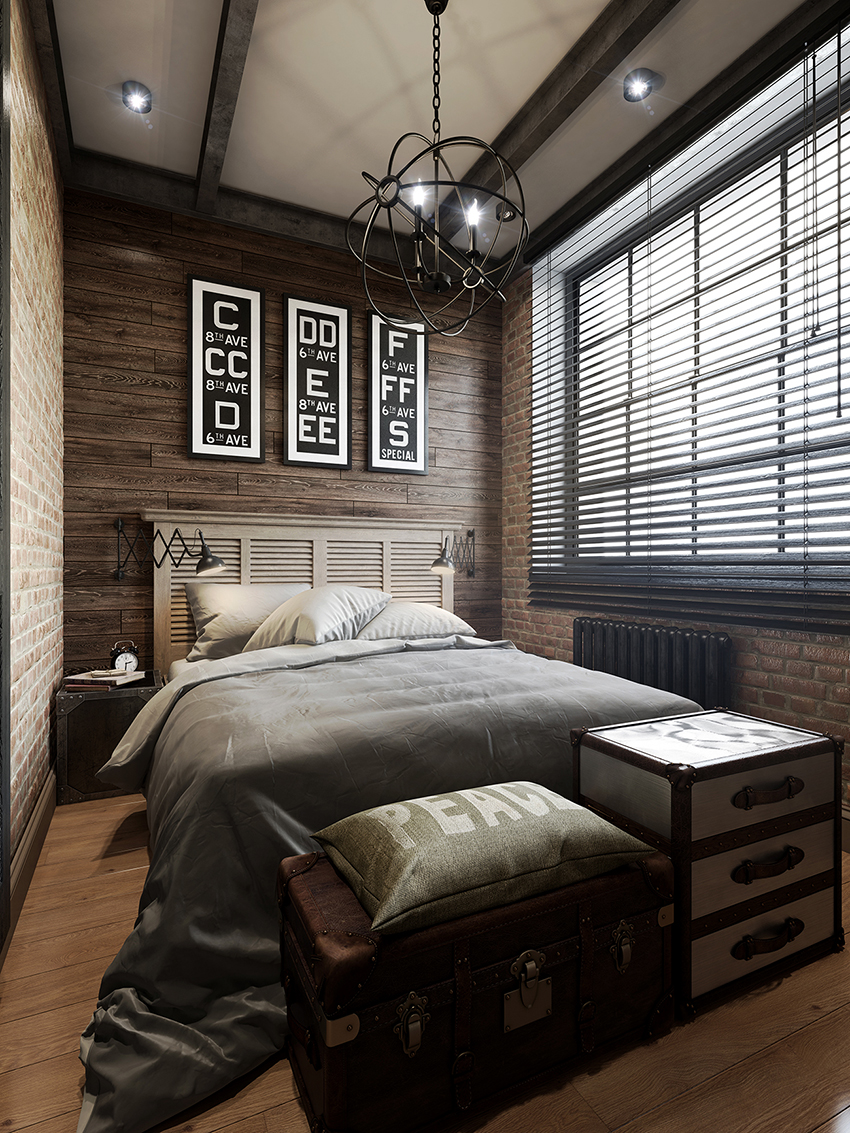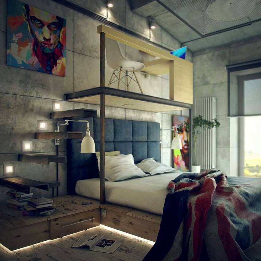 Free space and simplicity are welcome in the loft style. This direction is considered the most laconic and a little brutal. The headboard in such a bedroom can be made in the form of brickwork, framed by a ceiling and floor made of artificially aged boards. The room should have a minimum of furniture, so one bed will be enough. Storage systems are best hidden in niches disguised as walls. It is necessary that the decor is present in a minimum amount, so the headboard should be as simple as possible.