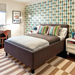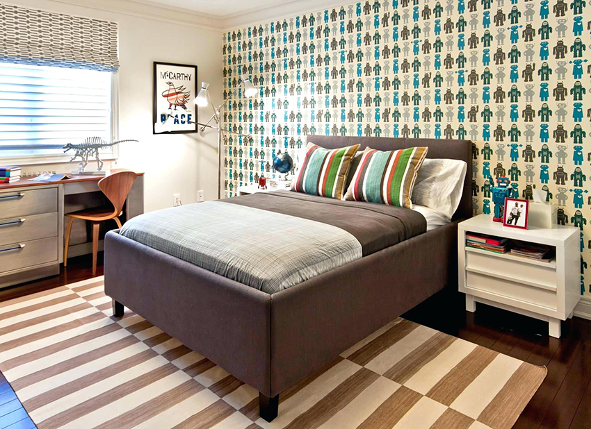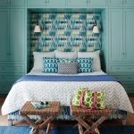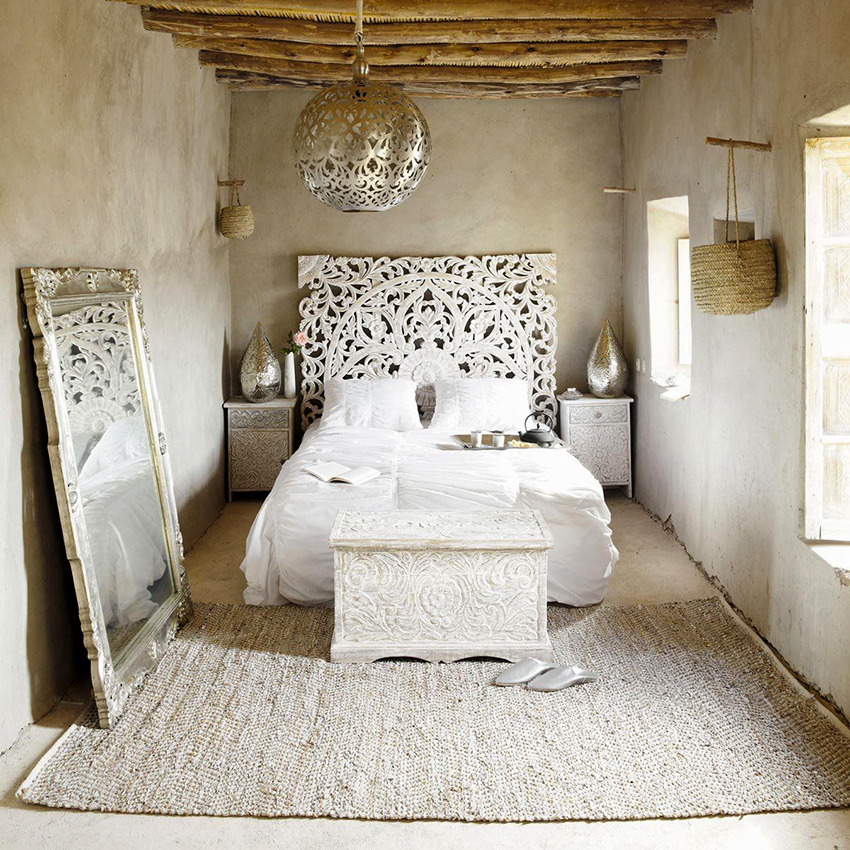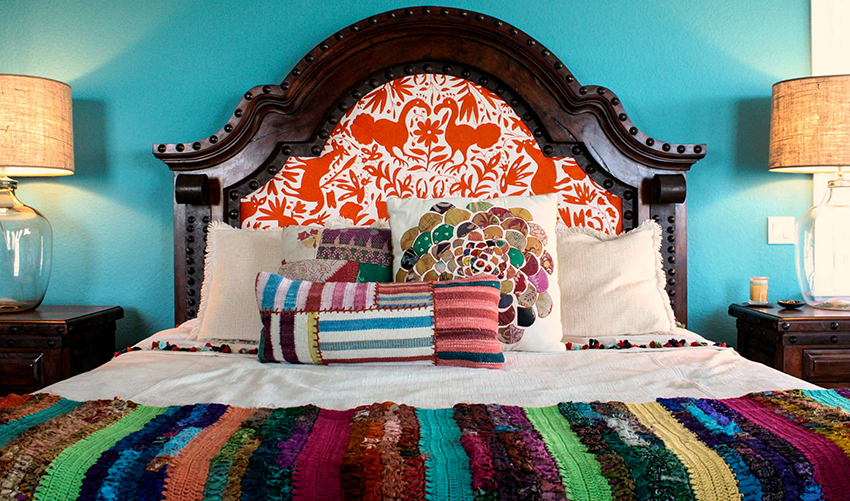If you paint a wall with a headboard in a color opposite to the shade of other surfaces, you can get the effect of space zoning. In the ethno style, wall canvases at the headboard are still relevant, but they are only outwardly similar to carpets from the Soviet past - their texture is much more practical.