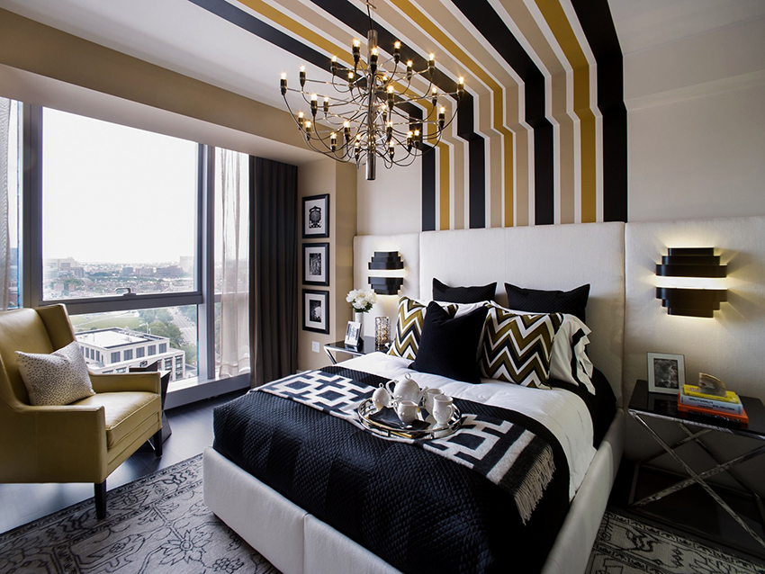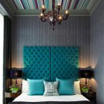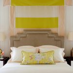 A special place in the species diversity of headboards is occupied by a high back, which visually allows you to increase the height of the ceiling. At the same time, it is not at all necessary to sew a backdrop from fabric or make it out of wood, it is enough just to paint the wall behind the bed in a different color. The headboard with vertical stripes reaching the ceiling will look original. Bright colors will help "blow up" a boring interior. To make the stripes even, it is worth drawing a sketch with a pencil, and applying paint using masking tape.