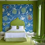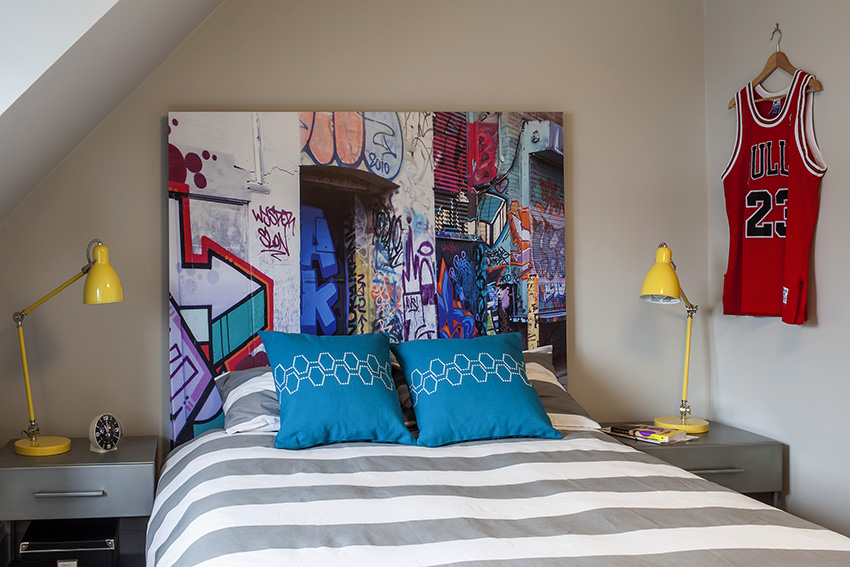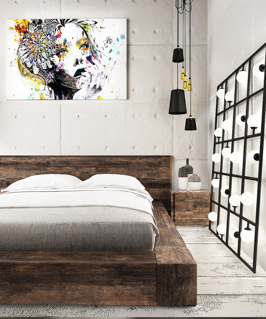 - You can use the results of your profession or hobby in the interior. For example, in the photo you can see how the picture is harmoniously combined with the bed, creating the appearance of its headboard.