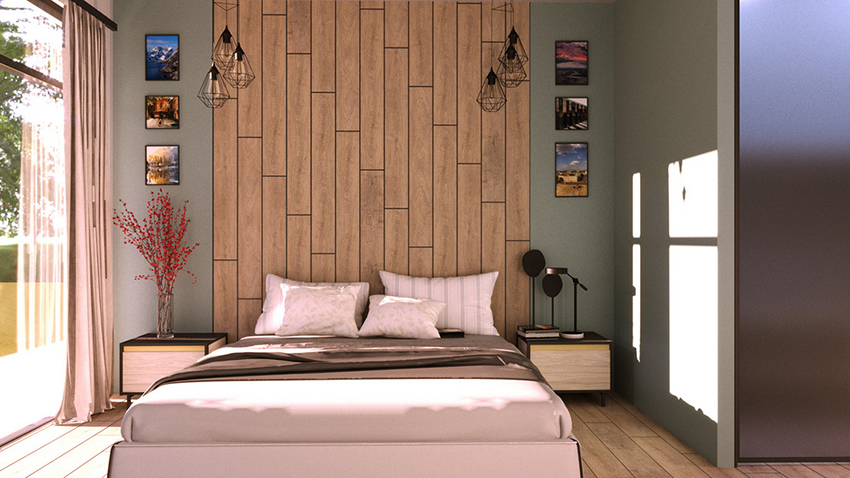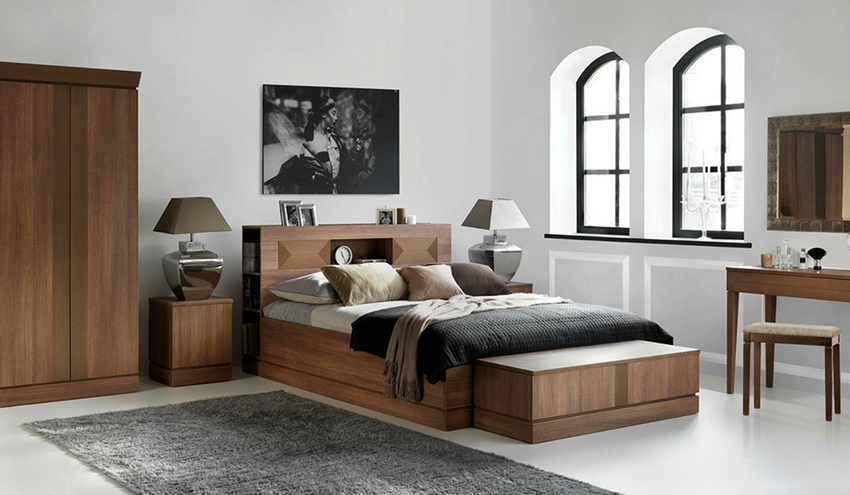 In many styles, a headboard made of wood is welcome.For example, in a bedroom made in a modern high-tech style, a backrest in the form of a fence will look harmonious, and in a loft style - a headboard that imitates a warehouse of pallets or boards. Quite often in modern interiors you can find shelves or a wardrobe at the head of the bed. This practicality is especially appropriate in small spaces. If the furniture is emphasized with accessories and lamps, then you can get a harmonious and cozy atmosphere.
