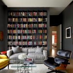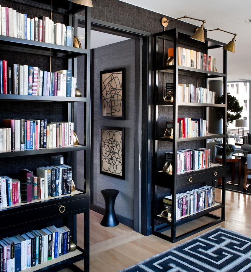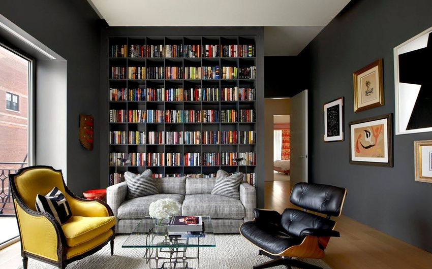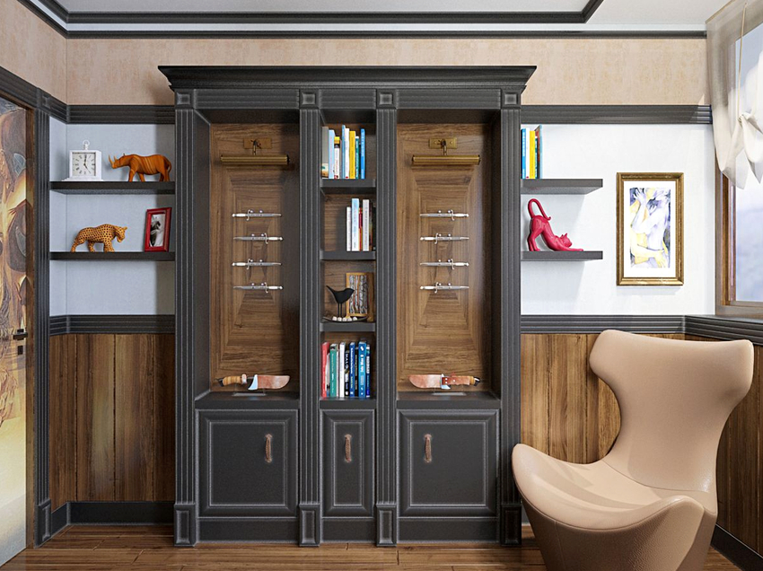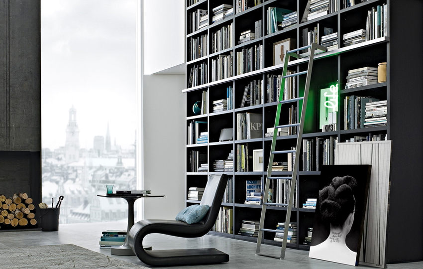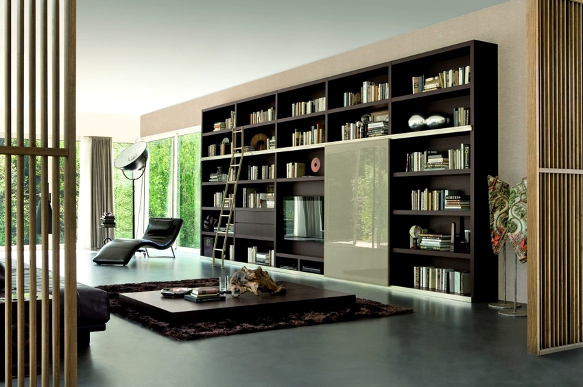 Someone will like the brutal variation of the product for a loft-style room. In this case, the book "monster" literally "grows" into the boards with its black mass, gloomily shining with the glass of the doors, behind which the books are under safe cover.