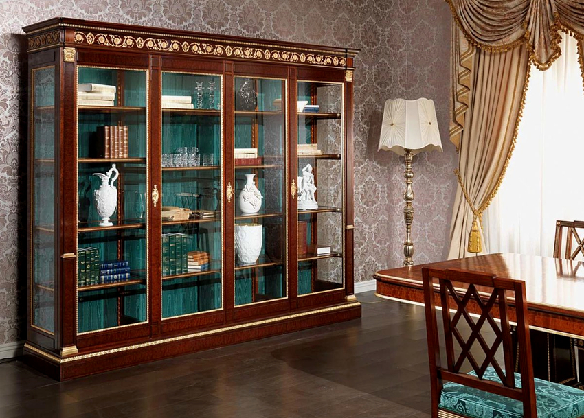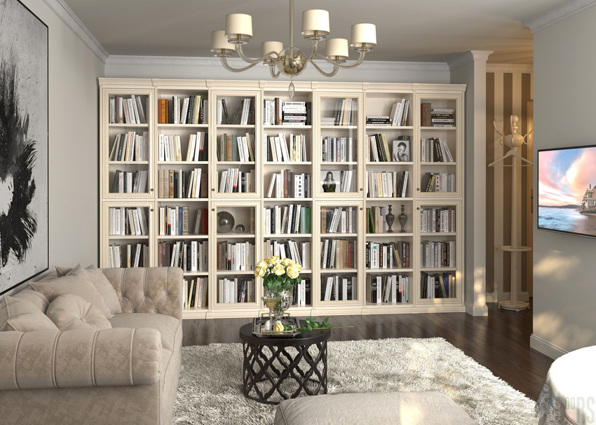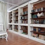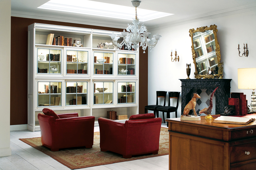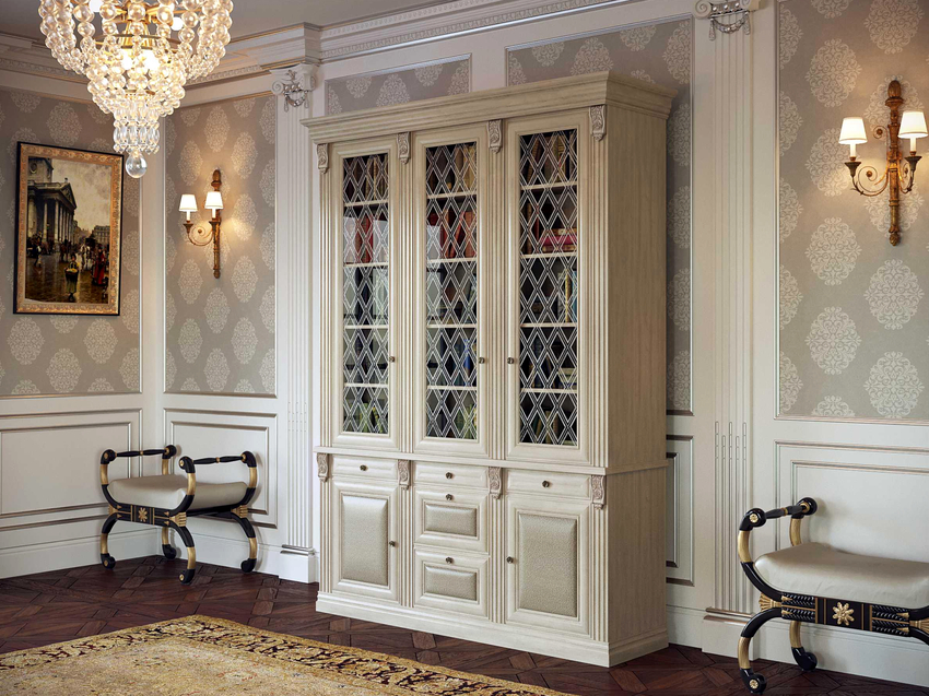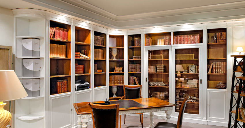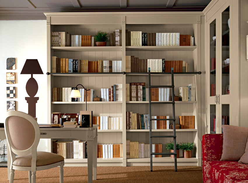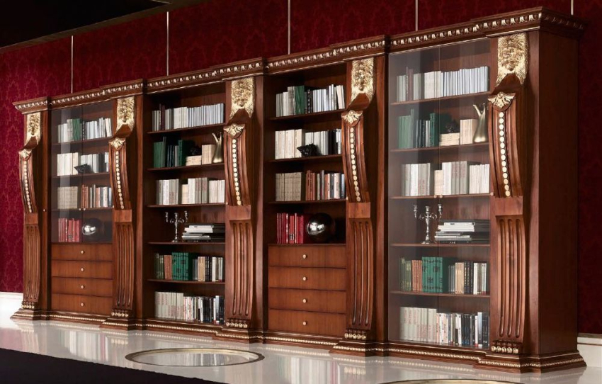 Classic-style rooms will be decorated with a white wooden piece of furniture - a bookcase with fittings of a similar design. Baguettes and carvings are acceptable decorative elements. At the same time, the design is designed to create an impression of luxury, solidity and grandeur.