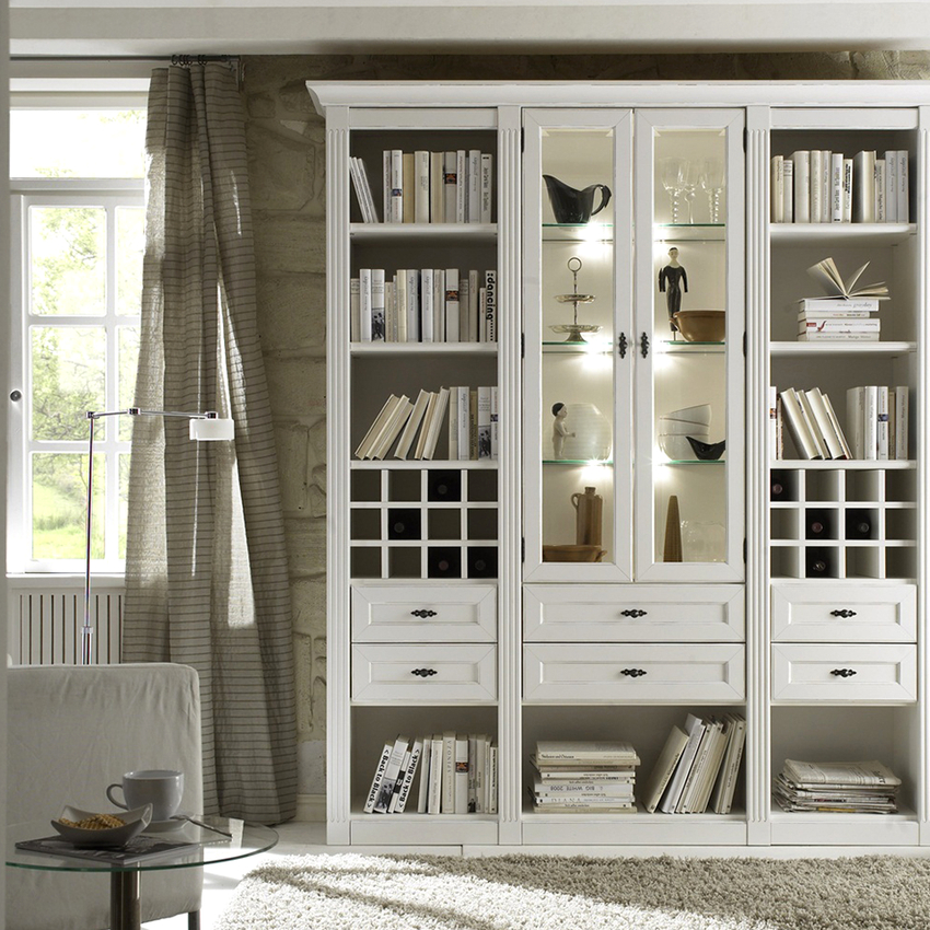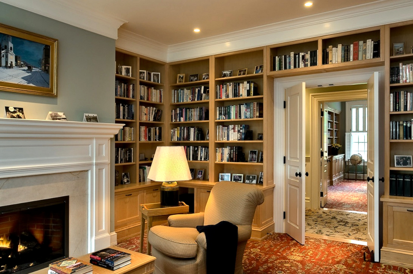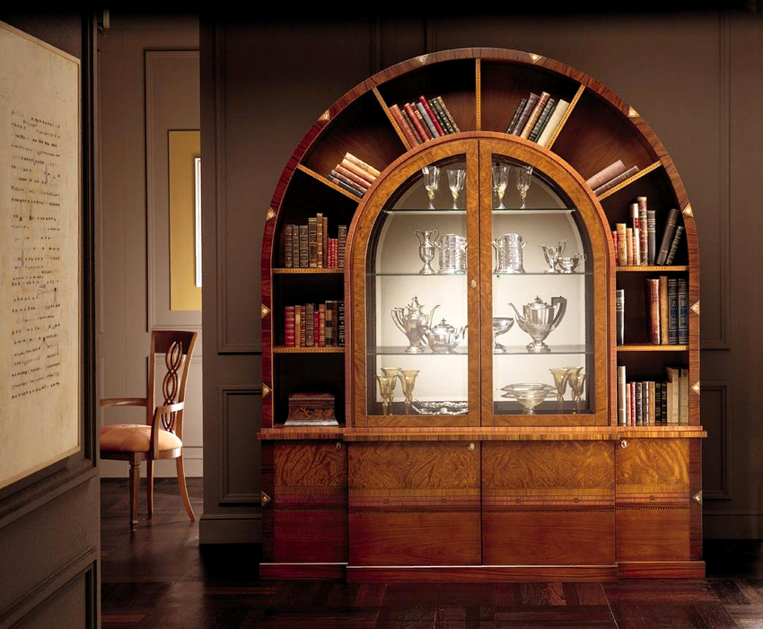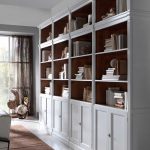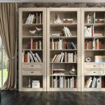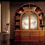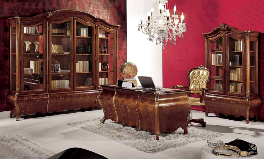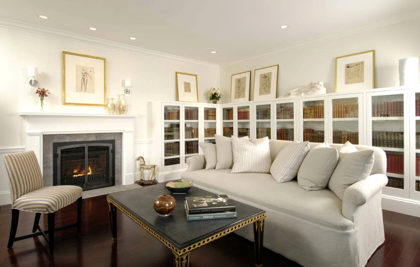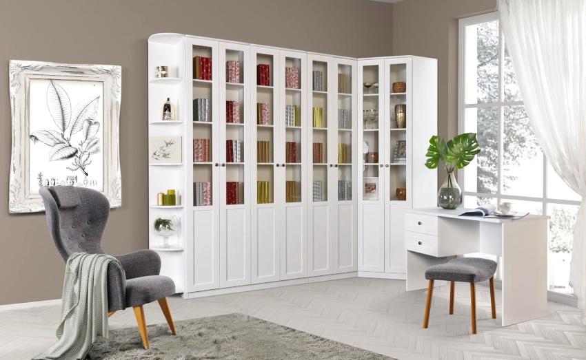 Classic-style rooms will be decorated with a white wooden piece of furniture - a bookcase with fittings of a similar design. Baguettes and carvings are acceptable decorative elements. At the same time, the design is designed to create an impression of luxury, solidity and grandeur.