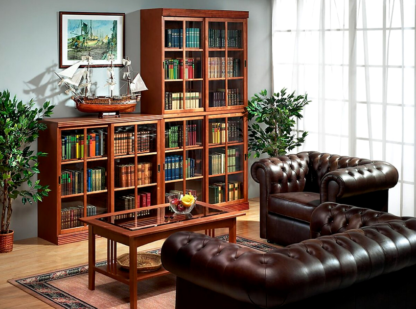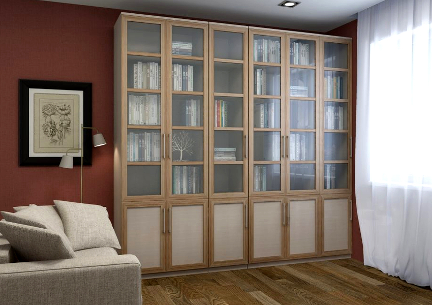 Perhaps the main difference between bookcases with glass doors is the type of doors. Depending on this parameter, the presented products can be: