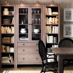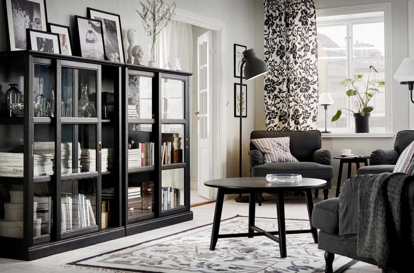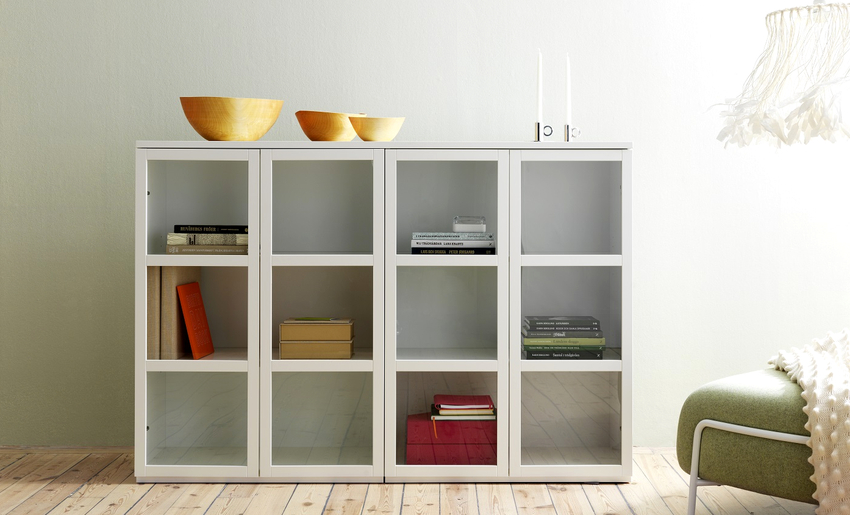 Perhaps the key feature of the Swedish manufacturer is that it makes it possible to design a room in a single stylistic design.For example, Ikea glass cabinets can be produced as one of the headset elements. At the same time, if necessary, you can easily purchase a cabinet, a table or shelves for books, characterized by a similar stylistic performance.