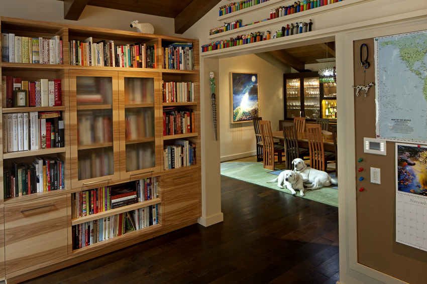 If the rooms do not have an area that allows you to install furniture for storing a literary collection, you can use the corridor or hallway. At the same time, additional illumination will not interfere with such a linear system at all.