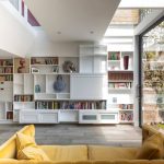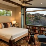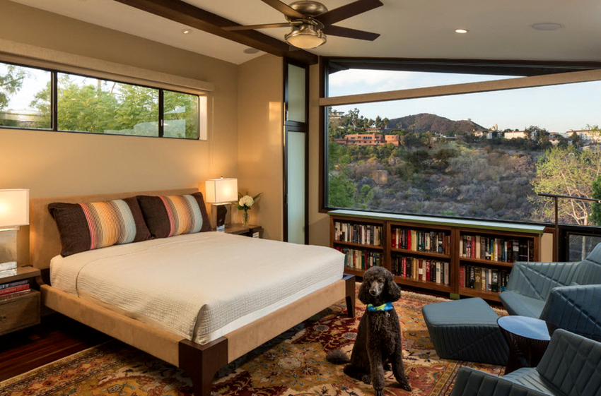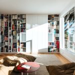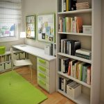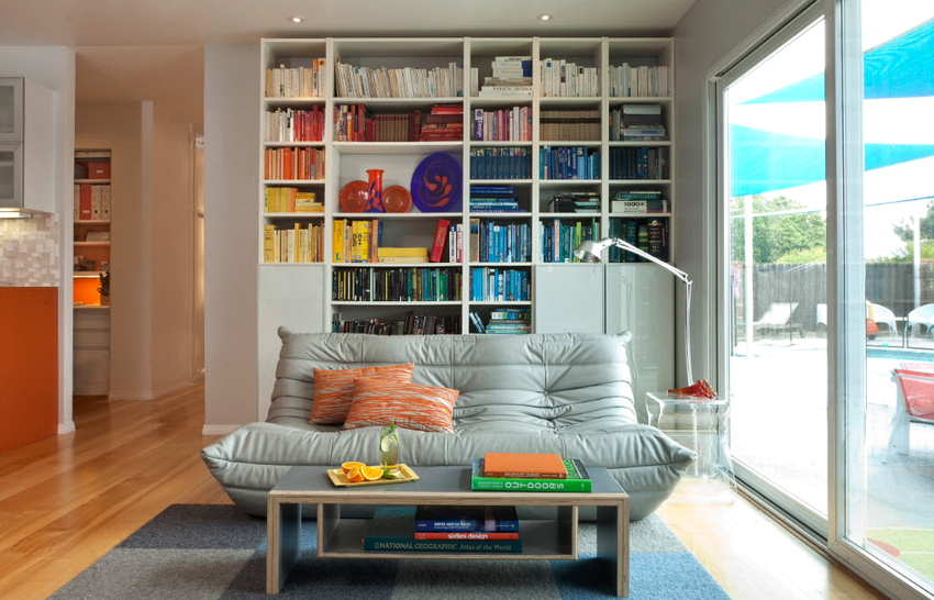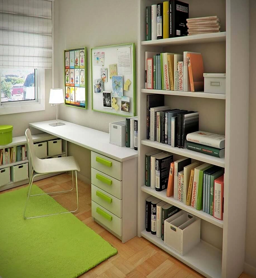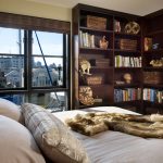 In the tiny room, there is also room for built-in book storage with sliding sliding doors. This is a pretty good solution for placing a large book collection in a limited space.