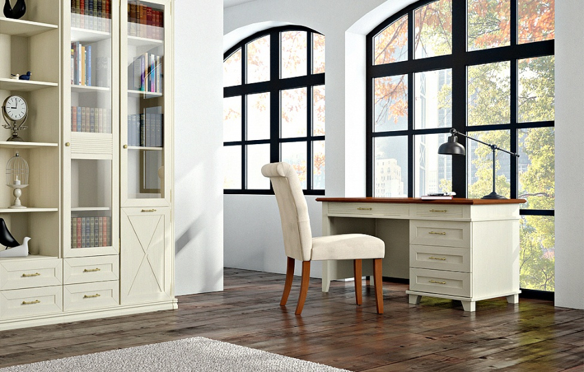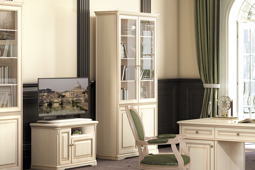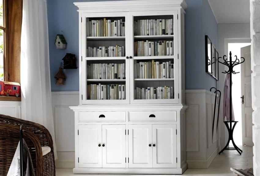 Playing a secondary role, the presented products do not attract undue attention to themselves and are an excellent addition to interiors made in Provence style. Such furniture is characterized by a sophisticated and elegant look. Moreover, such cabinets are spacious. They can store not only books, but also rare things and framed photos.