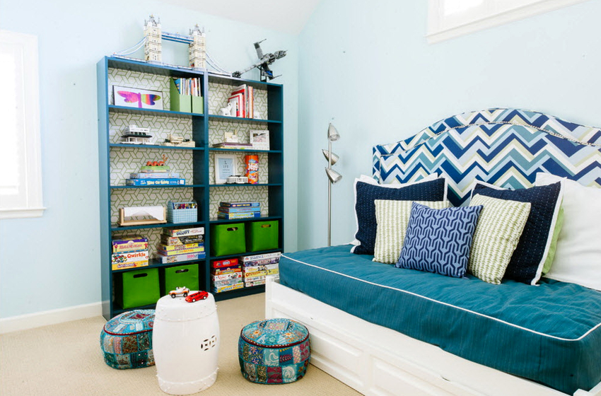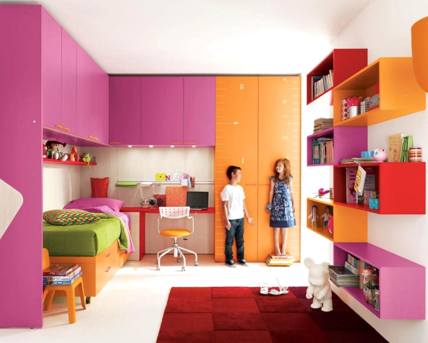 - Color scheme. For children's rooms, the best solution will be pieces of furniture with bright elements. Thanks to this, you can not only add color to the room, but also organize the storage system correctly. For example, shelves for books can be painted in one color, and for toys in another.