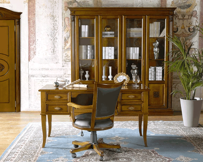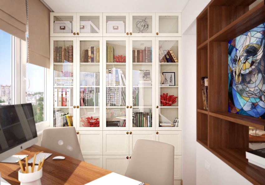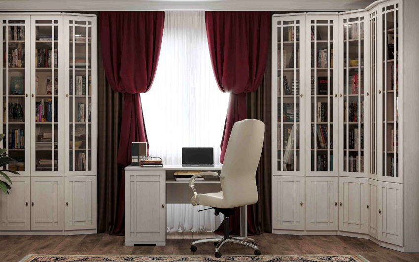 As for office space, in this case, high-tech furniture is perfect, which is characterized by laconicism and efficiency. A glazed pencil case will organically fit into such an interior, in which you can conveniently arrange books and folders with important documents necessary for work.