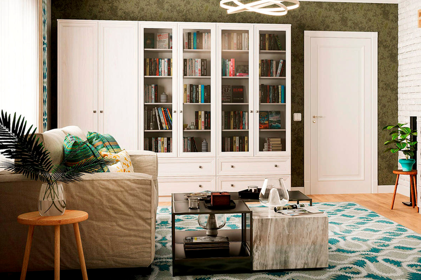 A white bookcase with glass doors will bring extra light to the room and become a creative highlight of the design. Speaking about the texture of furniture, it should be noted that glossy models will add solemnity to the interior, and matte products will harmoniously complement absolutely any design.