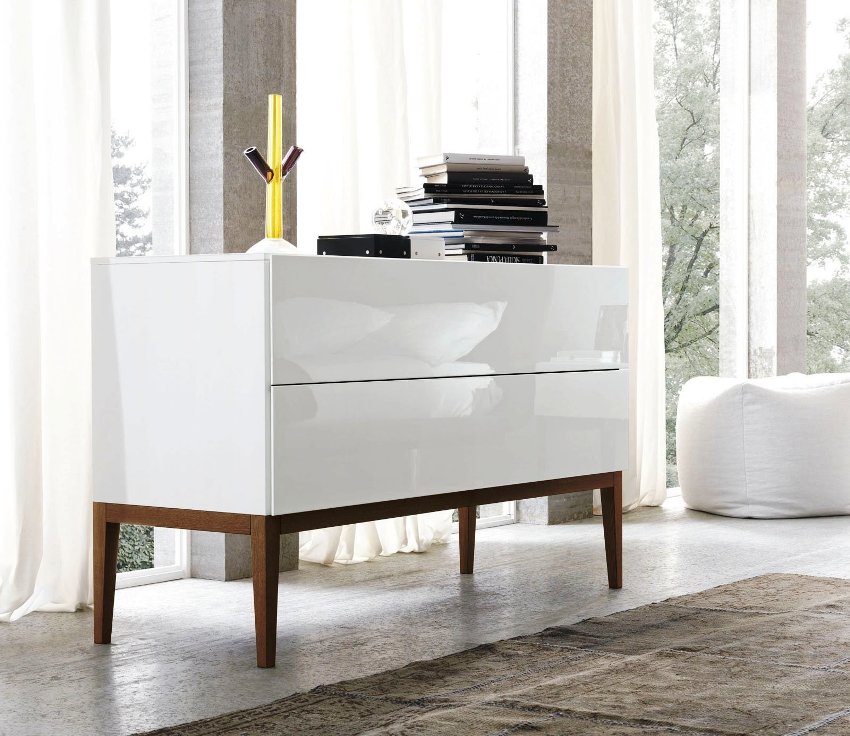 A feature of such furniture elements is that they have a small height. The limit for this indicator, as a rule, is only 1 m. This is due to the fact that such a height is optimal. These pieces of furniture do not overload the space in the corner. High chests of drawers for the living room of this type can be found on sale, but their purchase is often not meaningful.