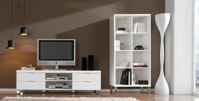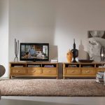 Helpful information! The design for the TV can be supplied separately or as a set with other furniture. A wall in a living room with a chest of drawers and a wardrobe is often found in the modern furniture market. In this case, the product serves as a stand for equipment and should be made in the same style as the rest of the kit.