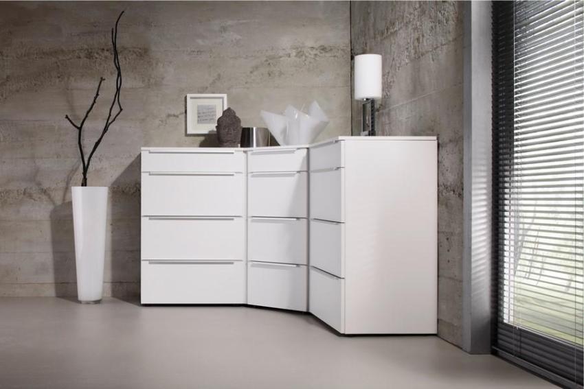 Indoor corners are an area that is often not used. A great solution for rooms (especially small ones) is to use this space to install a chest of drawers. Corner hull structures of this type allow rational use of the usable area of the room.