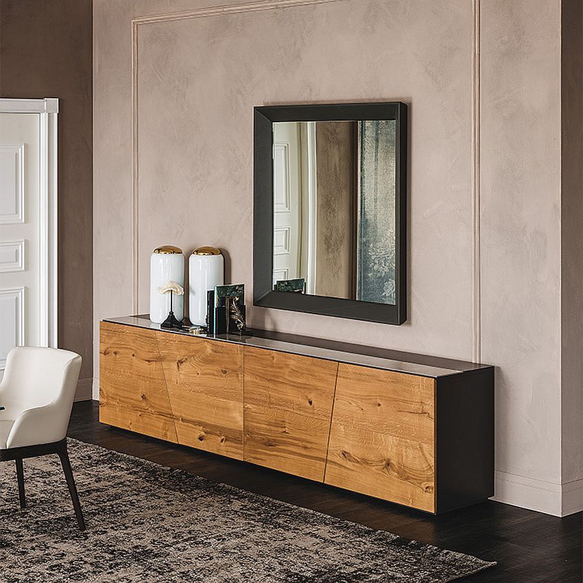 Long dressers in the living room (instead of a wall) have different designs. The shape of the structure can be oval or rectangular. Chests of drawers of this type are often complemented by mirrors that visually expand the space of the room.