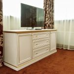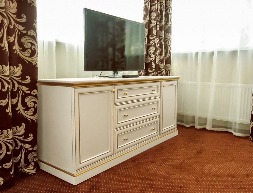 The practicality of such furniture has been proven over the years of its use, and it does not matter what size the room has. The dimensions of the TV are also not so important. A chest of drawers, which is used as a stand, performs other useful functions. Capacious drawers included in its design are used to store bed linen, clothes, etc.