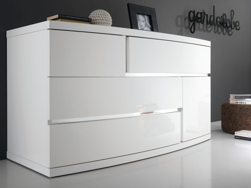 MDF. Structures made of MDF are more durable and wear-resistant than their compressed chip counterparts. Stylish chests of drawers in the living room in a modern style are obtained from this material. Photos confirm this fact. The advantage of such a material is that it is resistant to moisture. This is especially true for sheets that are varnished.
