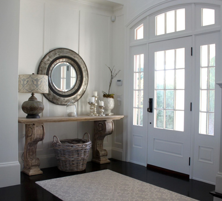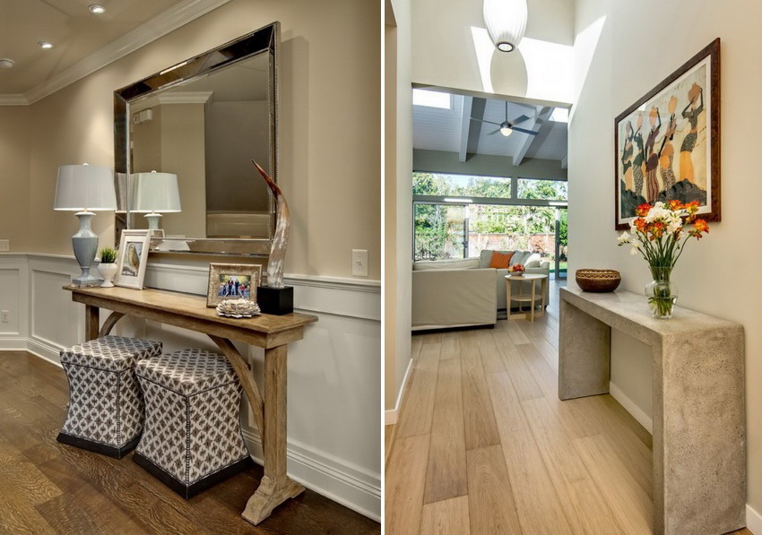 A mirror with a shelf is often hung above the console, made in the same style as the design. A small pouf can be located under the table. Different design options are shown in the photo of the consoles in the hallway.