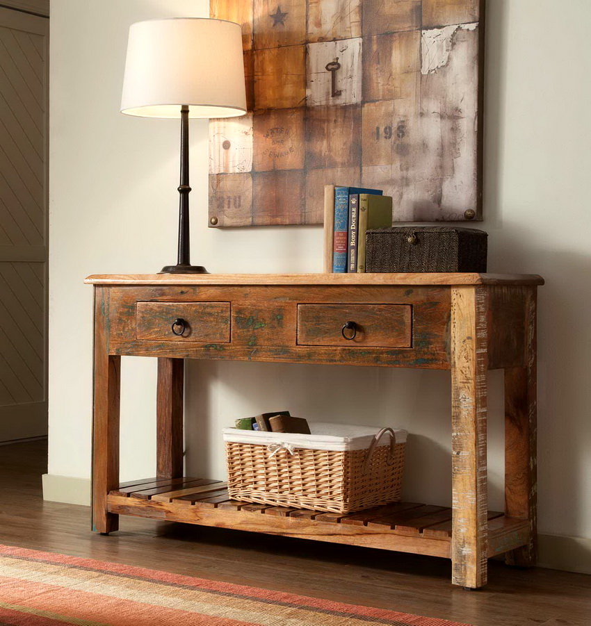 Models of consoles in ethno, eco and modern styles, made of natural wood or wood materials, look solid and elegant. The shade of the wood console should be in harmony with the rest of the furniture and decoration of the room. The colors of bleached oak, wenge and walnut are especially popular.