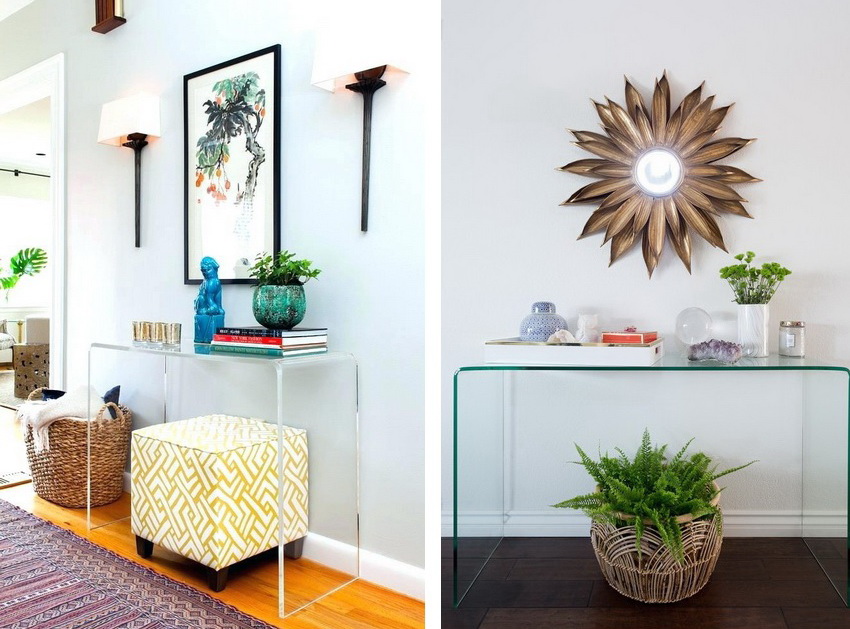 Quite often, tables are decorated with silk-screen printing, gold plating, mosaics, threaded inserts, artistic painting, inlays, which are clearly displayed by photos of consoles in the hallway in a modern style.