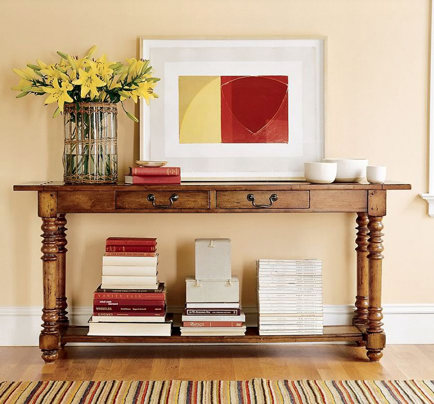Anyone can make a console table with their own hands. As with finished furniture, homemade designs come in a variety of designs. In the absence of creative skills, you can use the simplest decoration option - paint the table. To get a console with a worn effect, it is enough to cover its surface with a dye, apply petroleum jelly after it dries and paint the product again, but in a different shade. While the last layer sets, the ends of the table need to be lightly sanded.