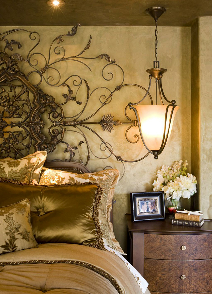 Lighting in the bedroom, where the wrought-iron bed is installed, must meet the following requirements: strict dark lines of the headboard and foot need a bright and targeted light flux; light, ornate patterns of forging should be illuminated with soft, "pouring out of nowhere" light.