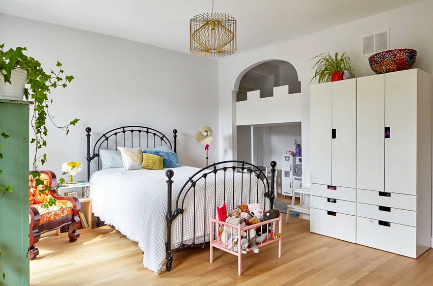 In small rooms, a metal loft bed may be the best option. The upper part (the bed itself) is located at a height of 120-150 cm above the floor level, under which they equip an area for games, a desk or shelves, and wardrobes. A ladder is used to climb to the sleeping place. The bed has bumpers.