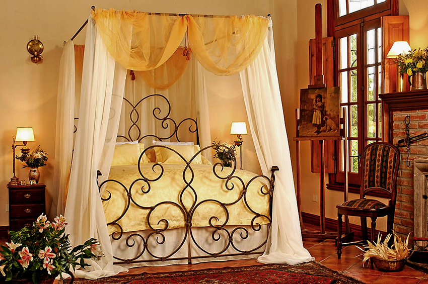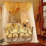 A special type of furniture - forged canopy bed... She creates a romantic atmosphere in the bedroom. It is better to install such a product in rooms with high ceilings and light walls. It is necessary that the approach be free, therefore, either the bedroom should be large, or a minimum of additional furniture is required.