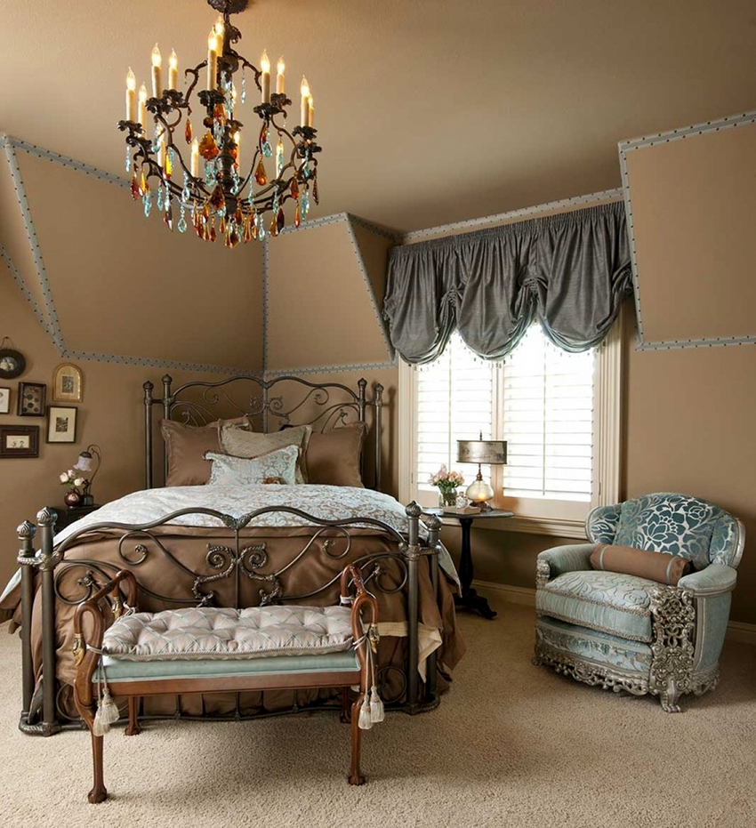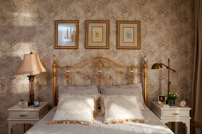 Most often, a classic version is installed in the bedrooms - a double wrought-iron bed in a dark color. It should be supplemented with products made of light silk fabrics in light shades. It is advisable to use pillows of small size, monochromatic, without prints. Light warehouses, openwork will soften strict dark lines.