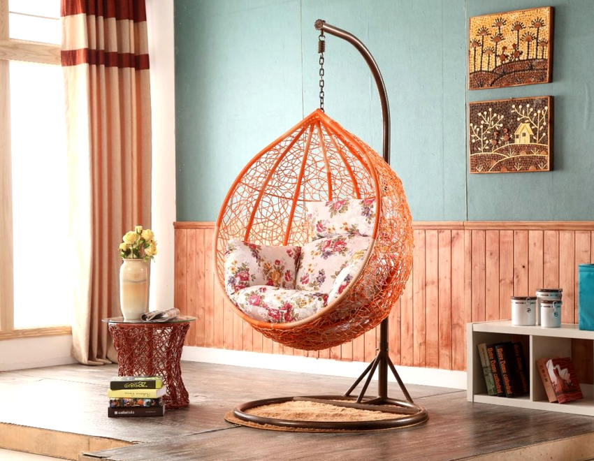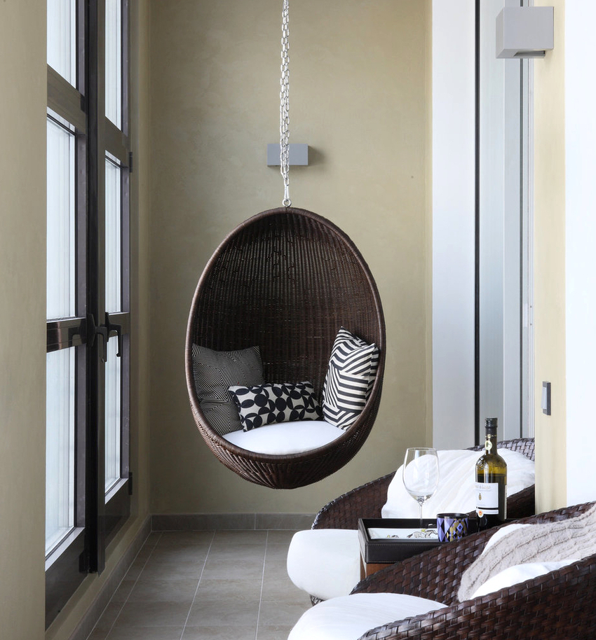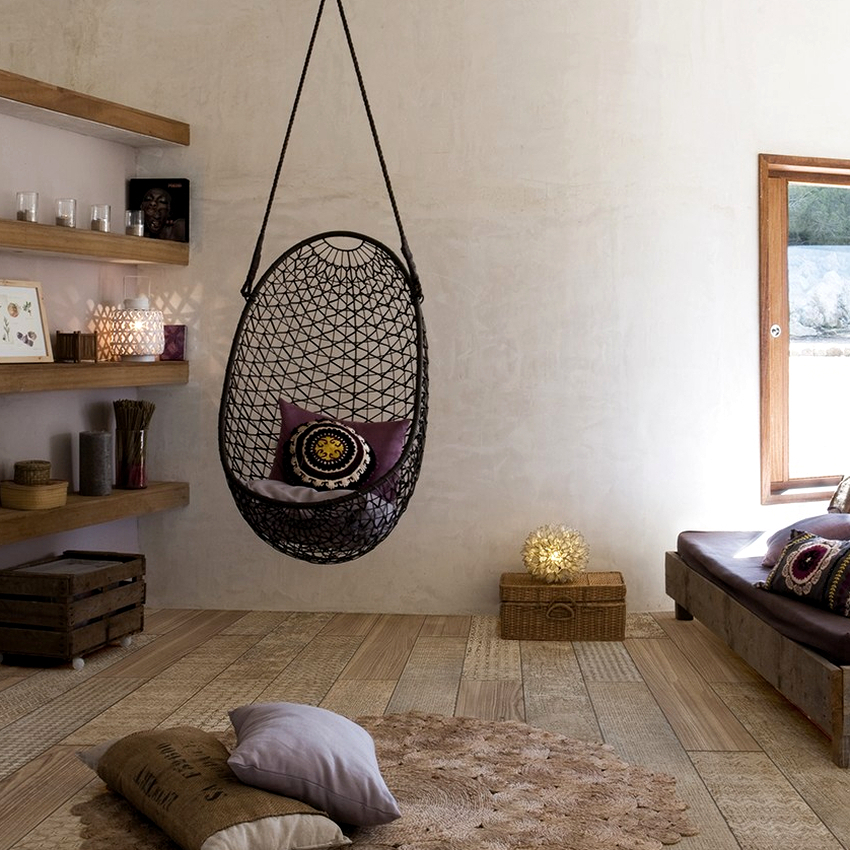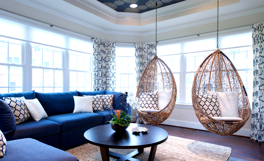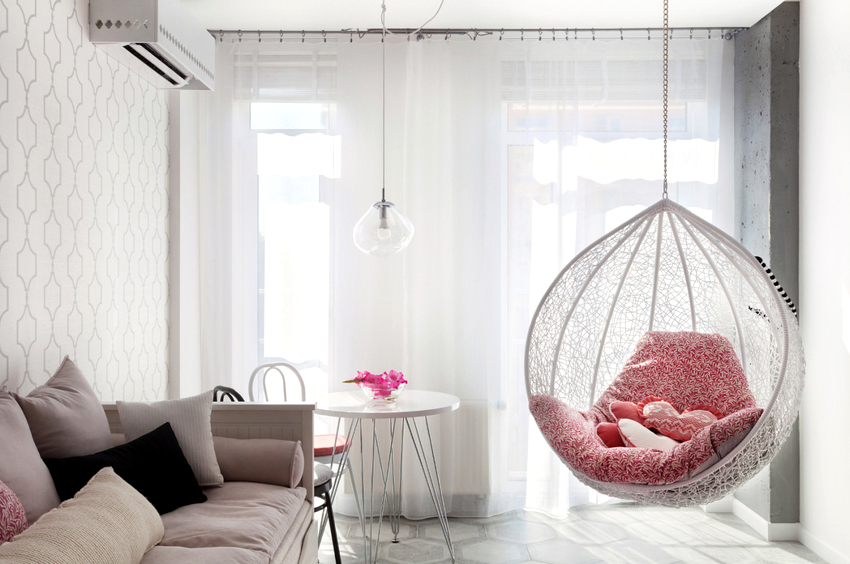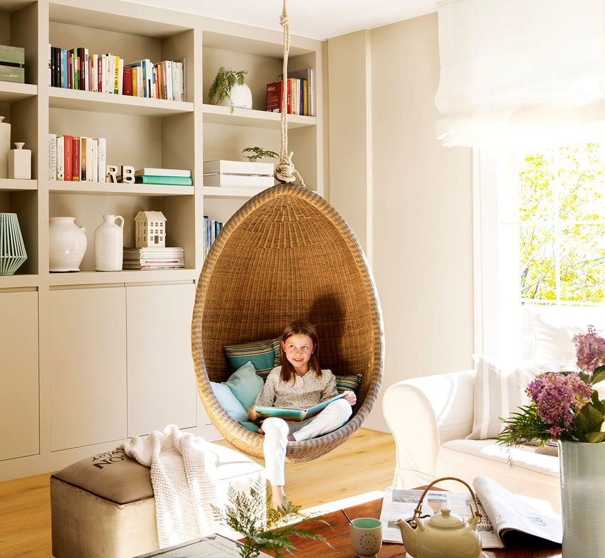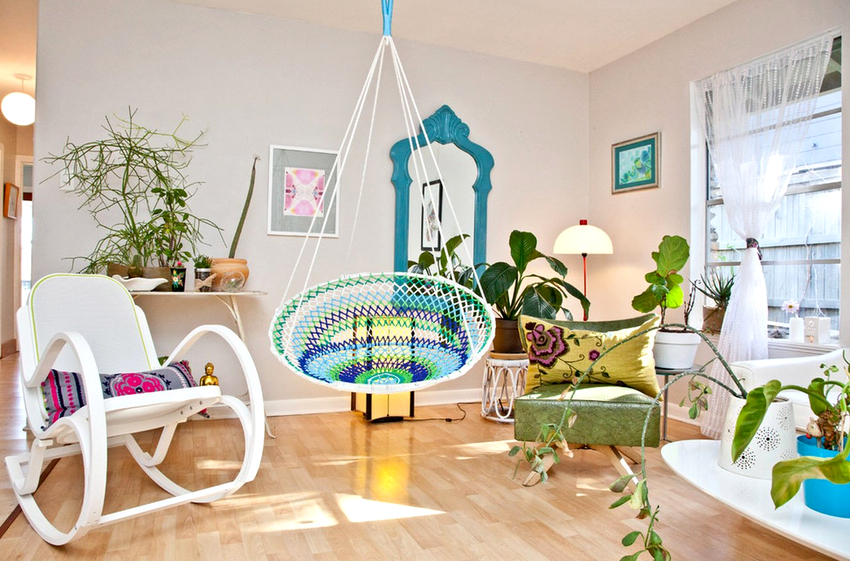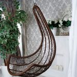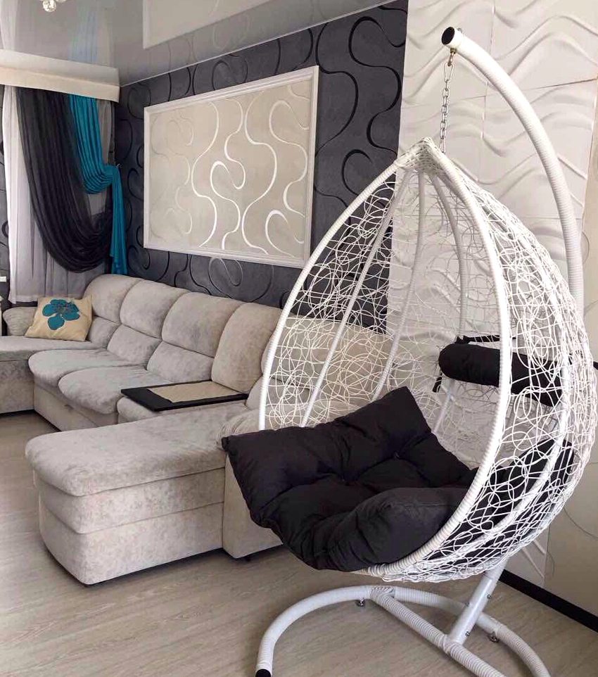Using a hanging chair in a room, you can create an unusual design where the product will be the center of attention. Another advantage is the organization of an additional seating area that does not take up floor space.Depending on the type of interior, you can choose an armchair made of the material that best matches the style:
