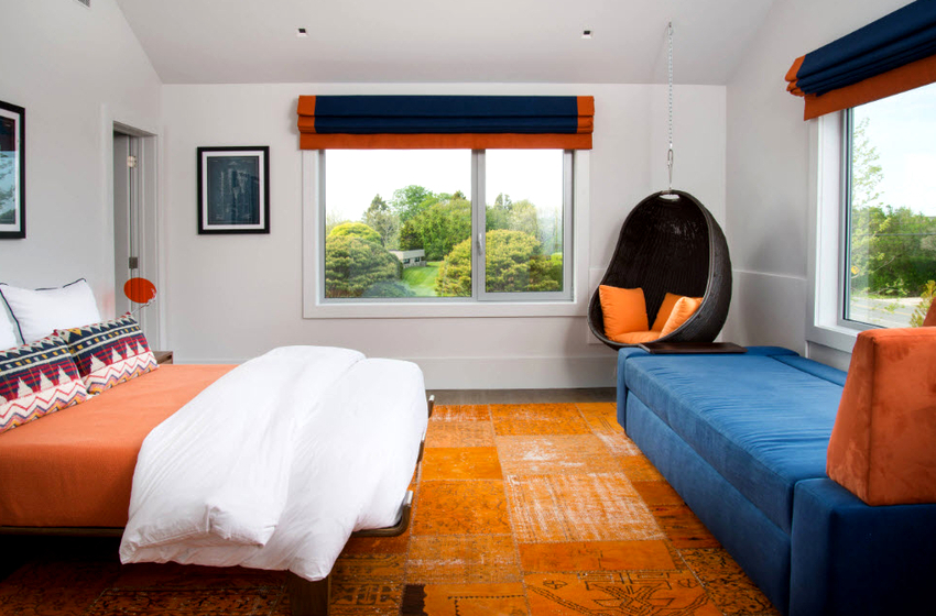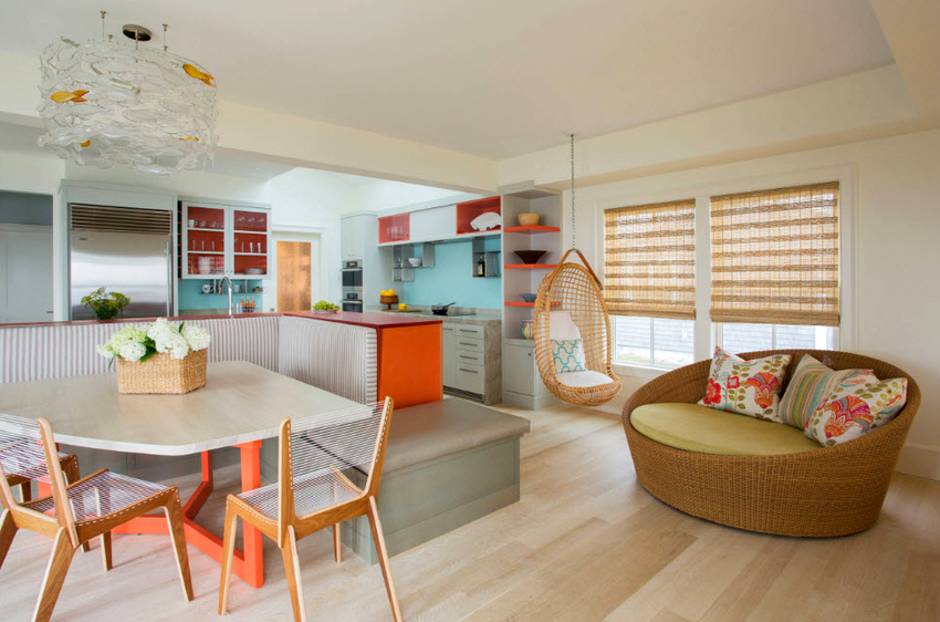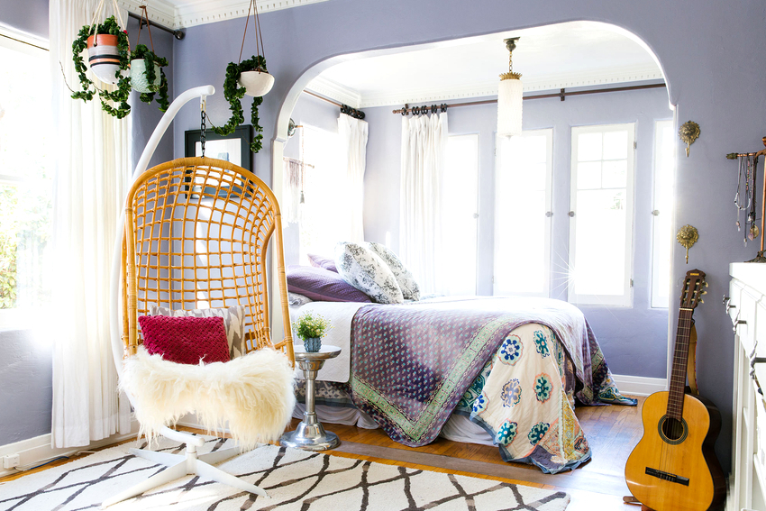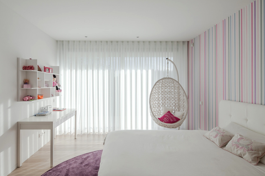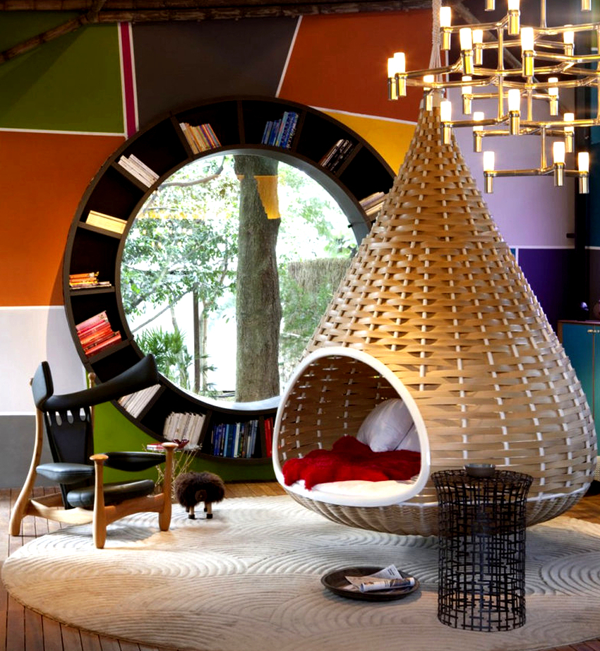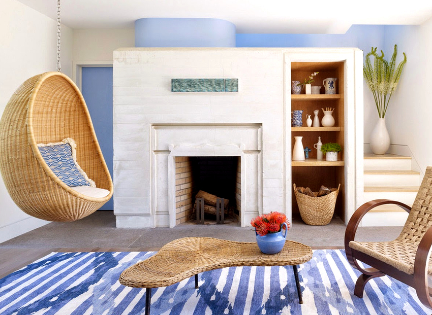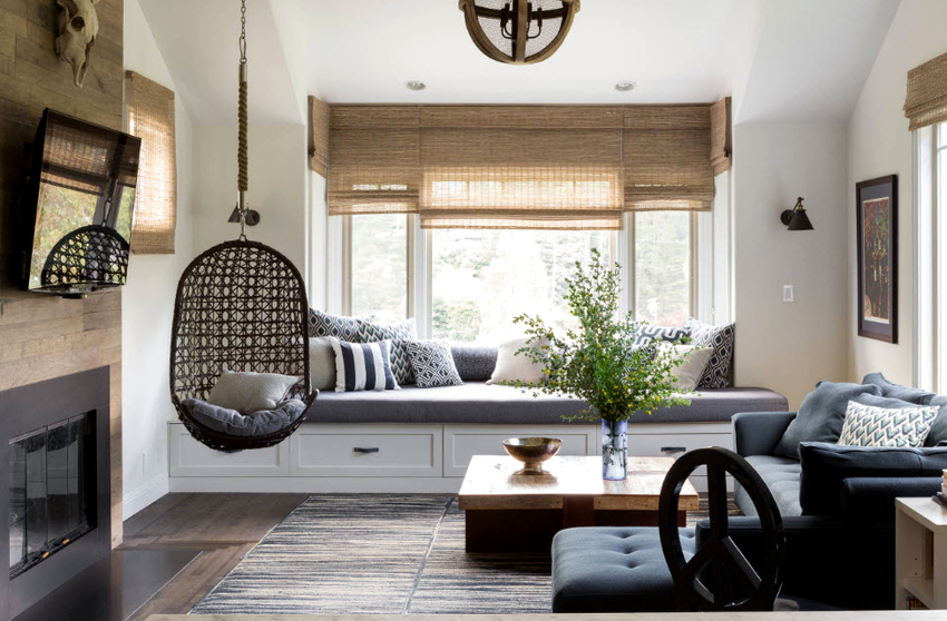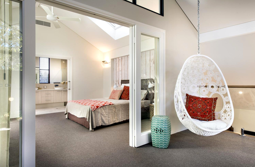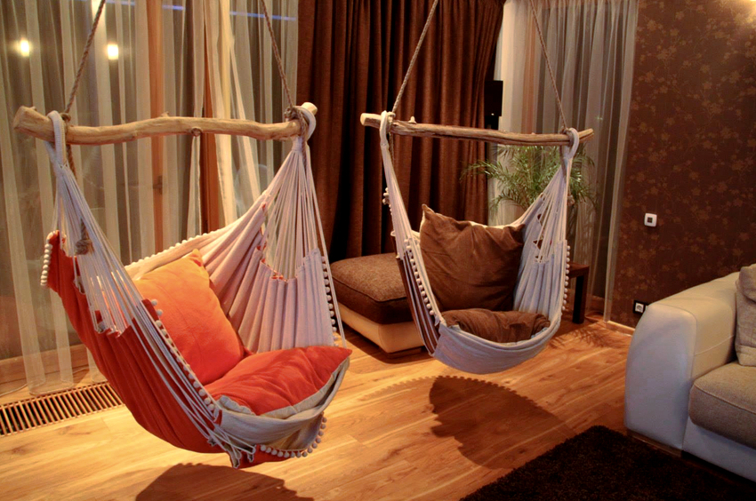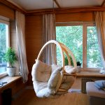Using a hanging chair in a room, you can create an unusual design where the product will be the center of attention. Another advantage is the organization of an additional seating area that does not take up floor space.Depending on the type of interior, you can choose an armchair made of the material that best matches the style: