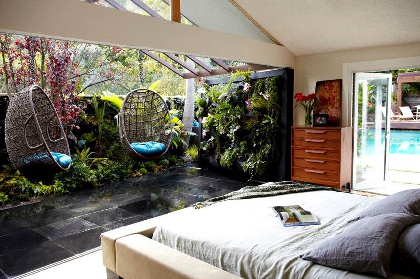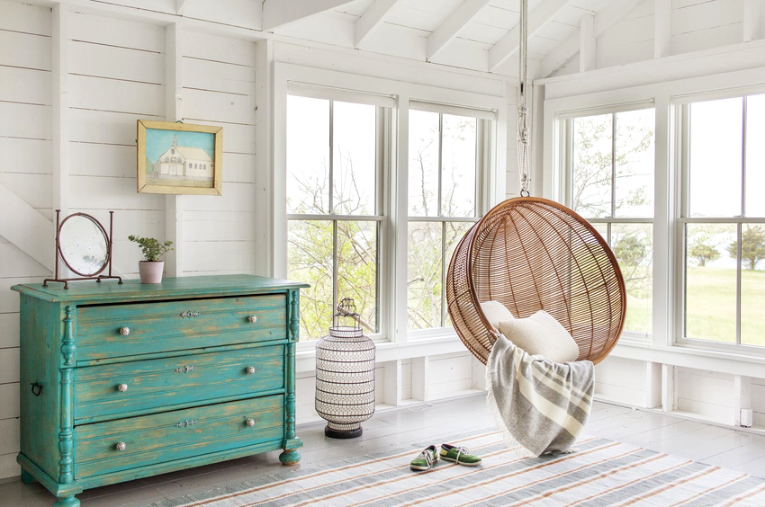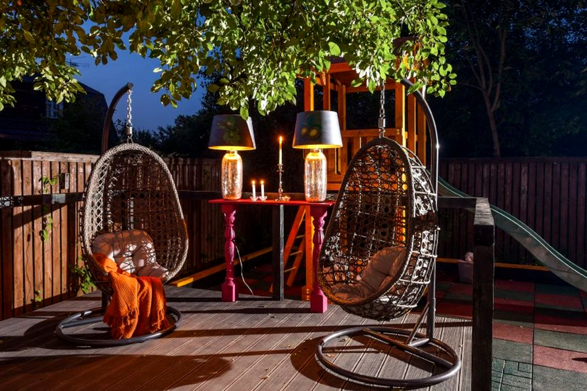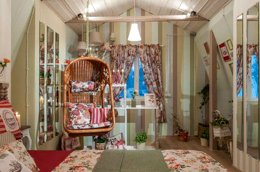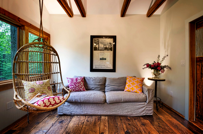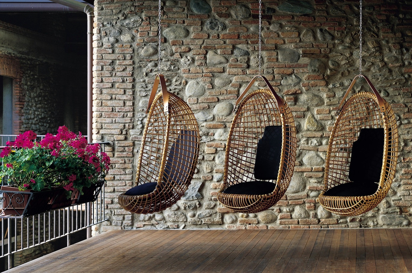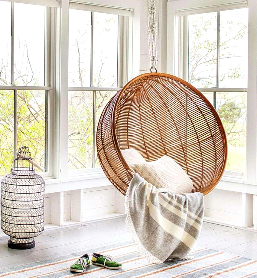 - Veranda. Most often, hanging products are found here, because there is nothing more pleasant than relaxing and rocking in a chair in the fresh air indoors overlooking a garden with living plants and flowers. Rattan swing chairs on a plank floor will be a great addition to any home.