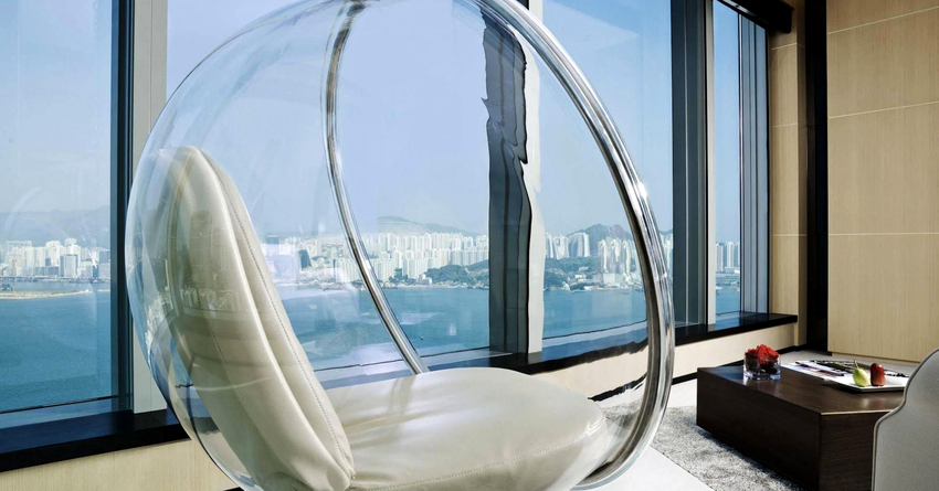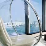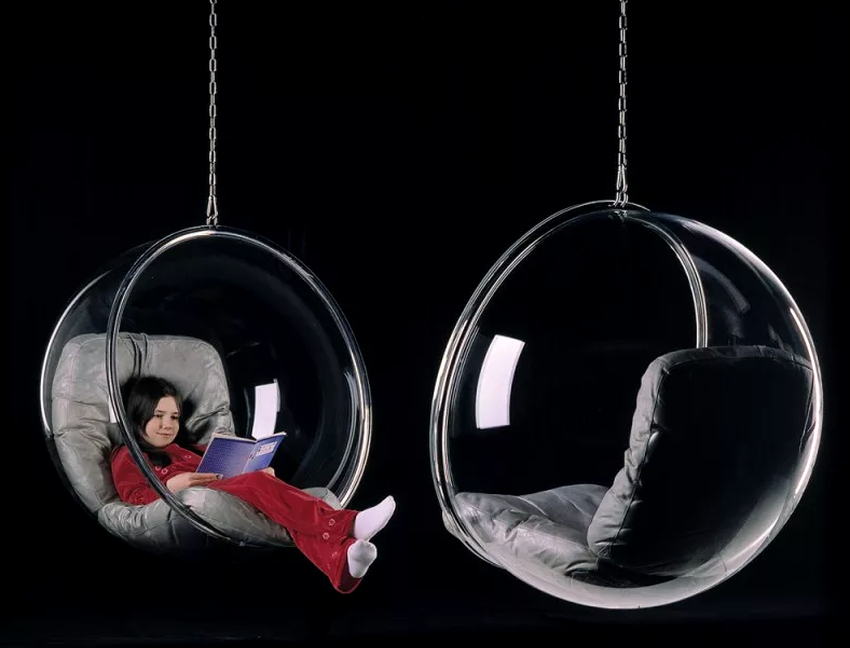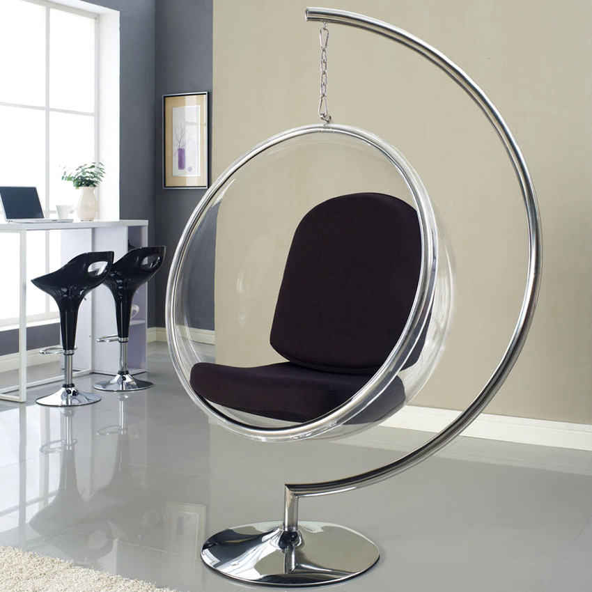 Plastic. Acrylic acts as a material of manufacture. The chairs are made either from matte or transparent plastic. The pieces of furniture are in the shape of a ball and can often be found in modern interiors in techno, high-tech or futuristic styles. The main advantages of using are the large weight for which the products are designed (about 200 kg), a long service life.