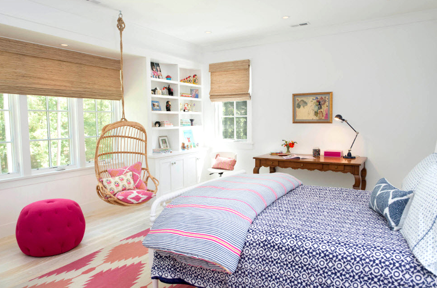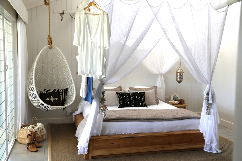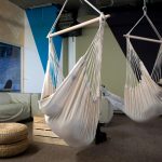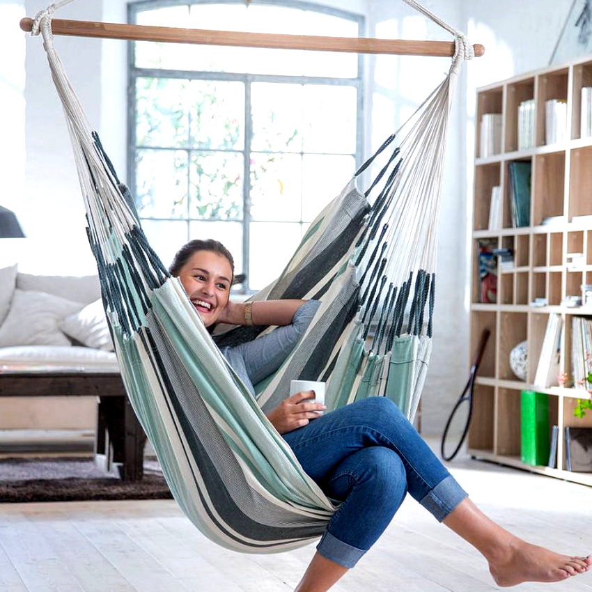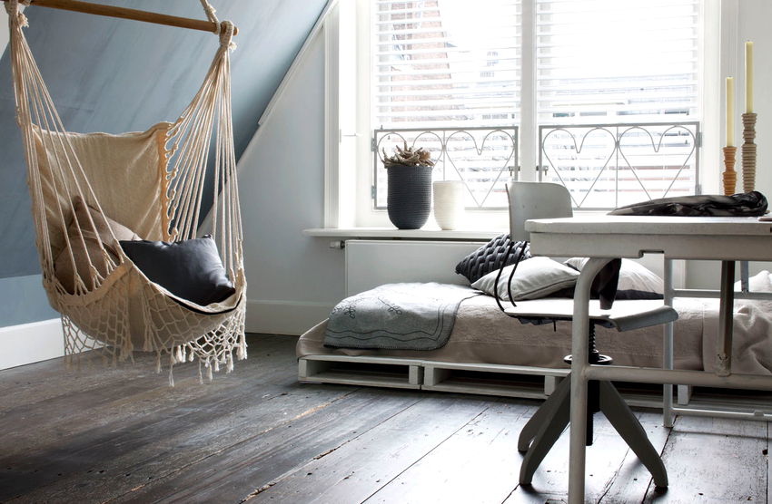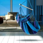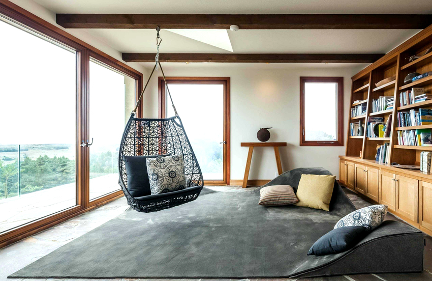 It is much easier to install a hanging chair in a room that is distinguished by the presence of ceiling beams. Firstly, in this case, it is not required to spoil the ceiling covering, and secondly, the presence of several beams allows you to sometimes change the position of the furniture. Another advantage is that the product can be removed at any time without leaving a trace of presence, as after ceiling installation. Before attaching the chair to the beam, it is important to make sure it can handle the additional load.
