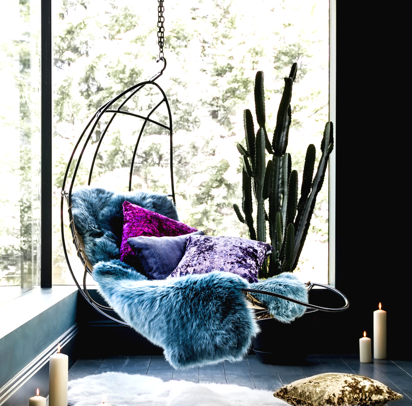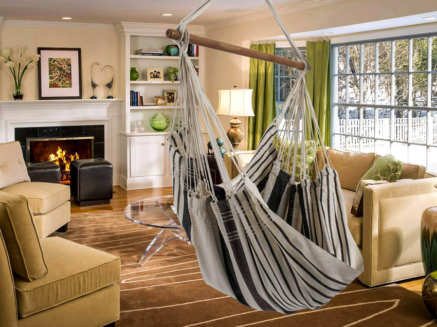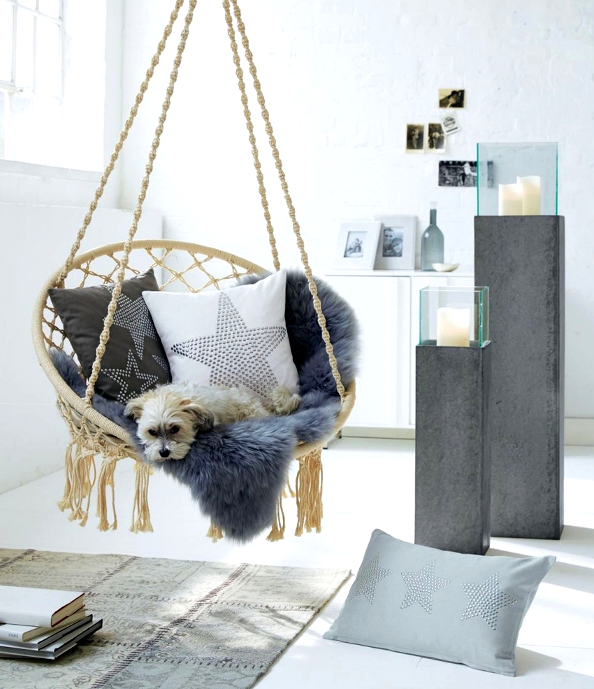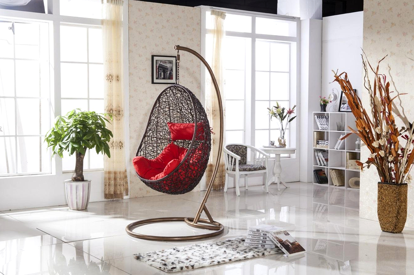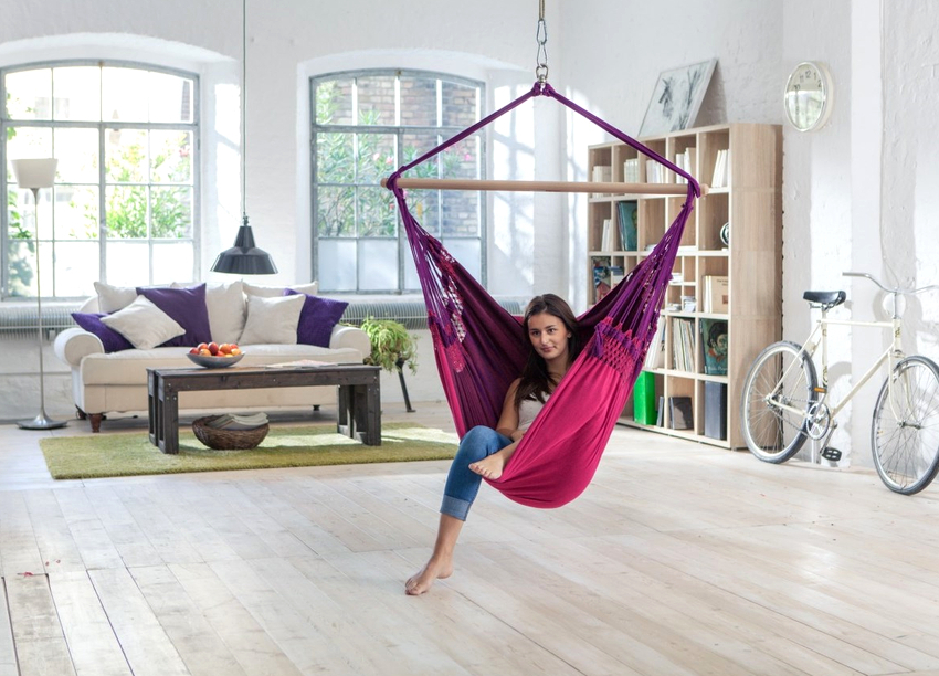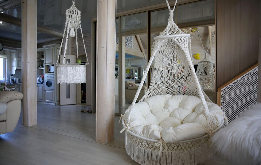 When choosing a place to install a hanging chair, it is necessary to take into account in advance the area that the hanging furniture model will occupy. If the product is too close to the walls or other pieces of furniture, you will not be able to feel the full taste of the purchase, because you cannot fully swing or spin. And also you need to be careful not to hang furniture close to sources of fire: stoves, stoves or fireplaces.