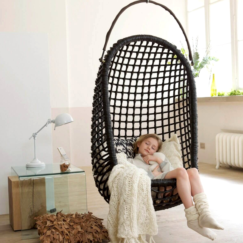- Cocoon. Thanks to the high side walls, which make the interior space closed and detached, it is possible to rest and relax in it. A baby hanging chair-cocoon will serve as an excellent place for rocking a baby or resting an older child, because at any age the suspended state has a relaxing effect on a person. Suspended swing chairs cocoons can be harmoniously used in the arrangement of any room of various designs.