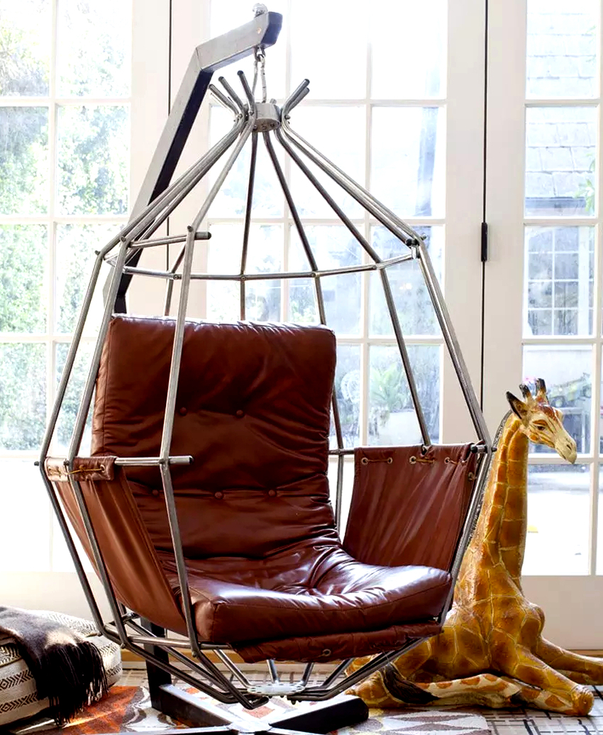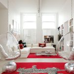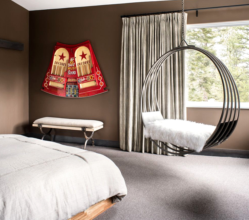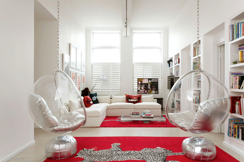 Hanging chairs in the interior look much more impressive and create a feeling of weightlessness in space. A chain falling from the ceiling or a long thin cable, with a competent approach, can be made an integral part of the room, and, in addition to its main function, it will play the role of a decorative item.