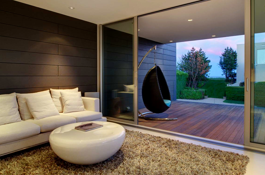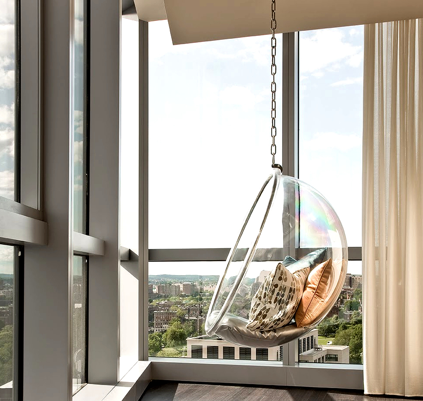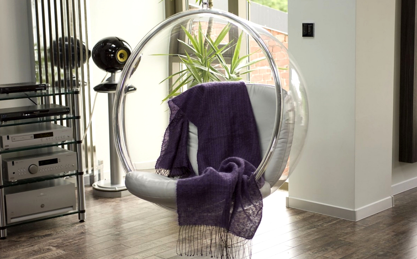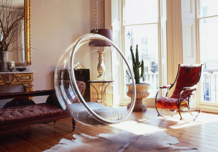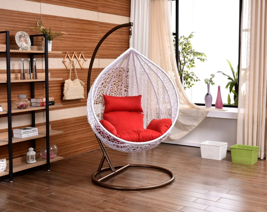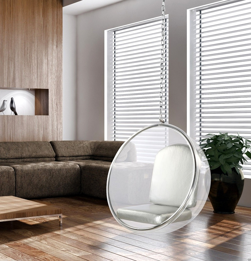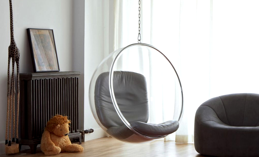 - Swing eggs, or, as they are also called, balls or nests. They are striking in their shape and appearance. Various materials are used for the production of these types of chairs, most often durable tempered glass or plastic. Looks good in ultra-modern interiors such as minimalism or hi-tech.
