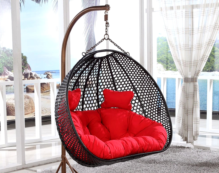 - Practicality and ability to withstand heavy loads. Mostly rattan hanging chairs are designed for a load of about 120 kg. Products made of artificial materials or on a metal frame can withstand a weight of up to 150 kg, which will be enough for two people of average build or for an adult with a child.