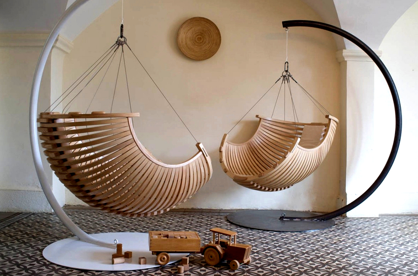 Usually, the designs resemble a swing, so they will look good in a summer cottage or in a children's room, especially if natural materials such as vine or rattan are used for production.