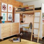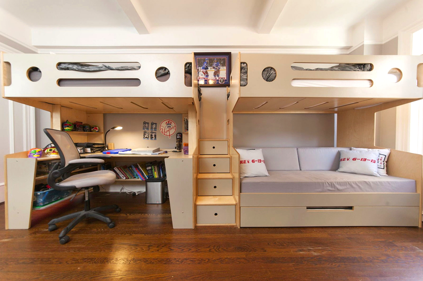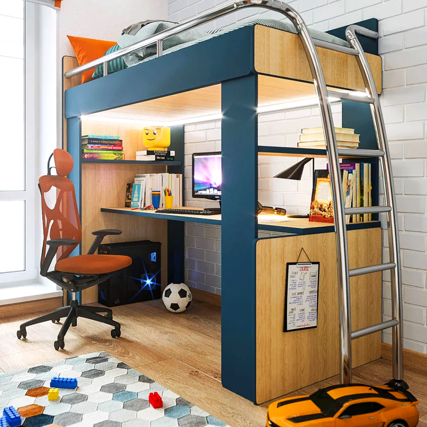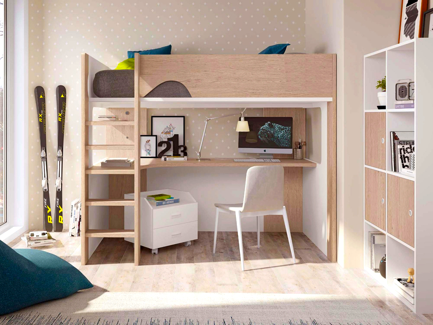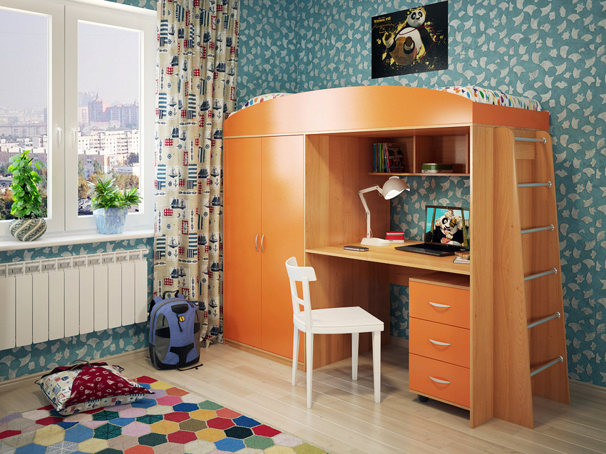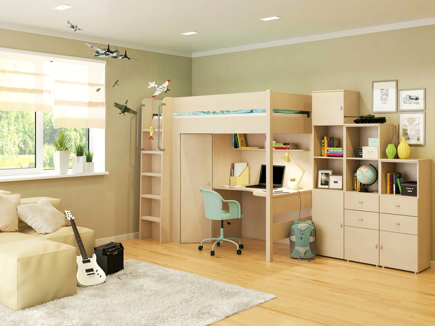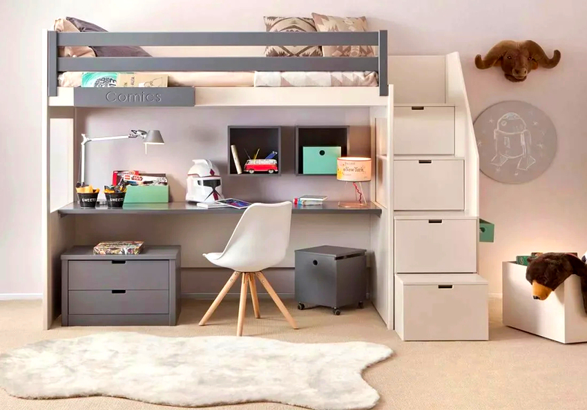 The best option for arranging a teenager's room is a bed with a built-in work area. The designs combined with the table are popular. You can see them in the photo of children's loft beds for boys. A writing or computer desk can be combined with a shelf, cabinet or bedside table.