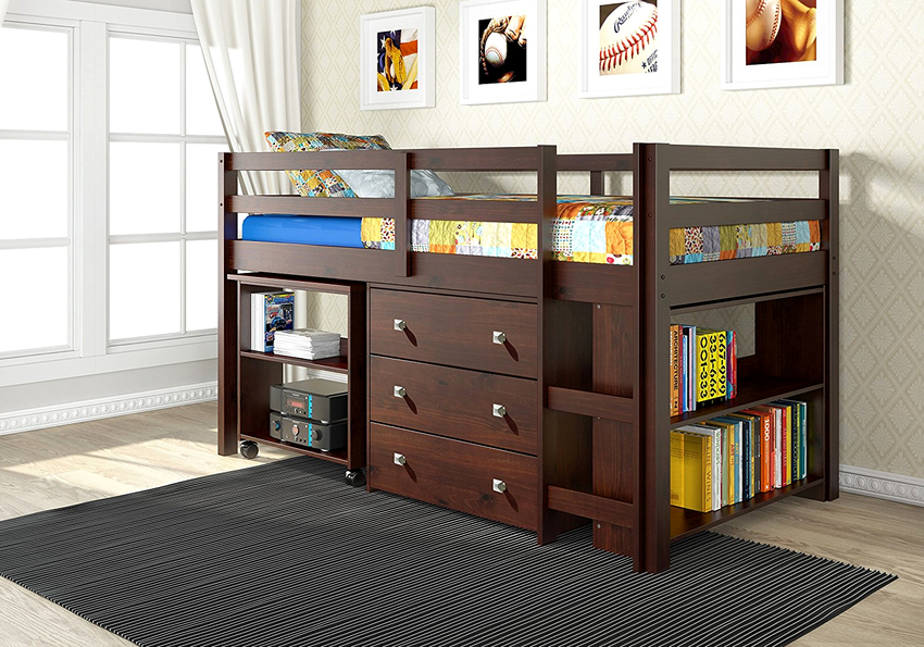Smooth lines of the structure will help reduce the likelihood of injury to the child.Usually, a loft bed does not have potentially dangerous elements and parts, and the structure is decorated with fittings without sharp protrusions.
