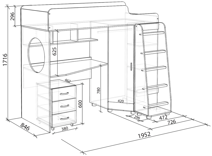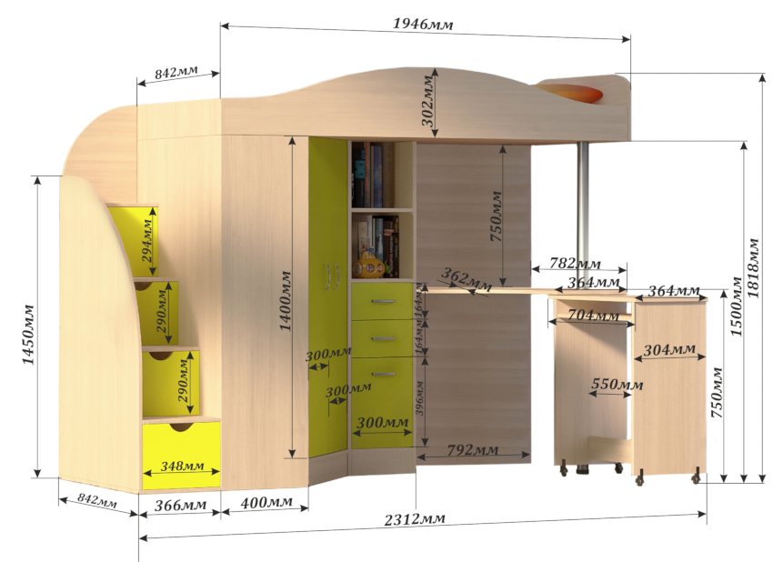 - profitability - individual pieces of furniture together are more expensive than a set, in addition, all elements of the loft bed are made in the same style;
