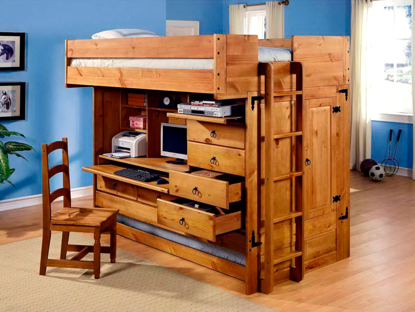 It is very important for a teenage child to have their own uniquely decorated place. Handcrafted pieces of furniture will help create an original and unique interior. A loft bed with a wardrobe and a table for a teenager will not only become a decoration for a children's bedroom, but will also optimally organize the space of the room. For this, even the minimum area of the room will not be an obstacle. The ideal option in this case is a loft bed for two children.